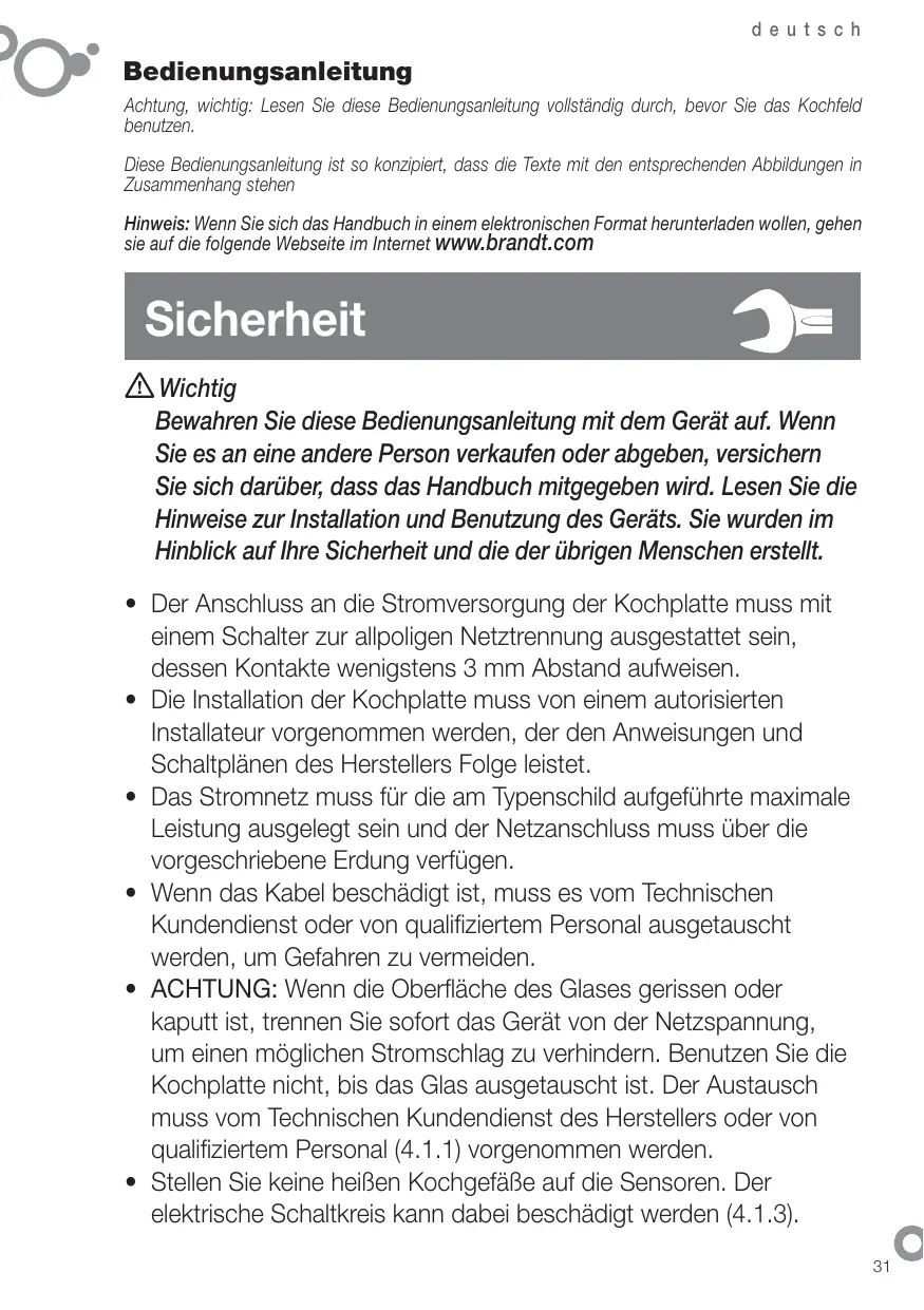 deutsch Bedienungsanleitung Achtung, wichtig: Lesen Sie diese Bedienungsanleitung vollständig durch, bevor Sie das Kochfeld benutzen. Diese Bedienungsanleitung ist so konzipiert, dass die Texte mit den entsprechenden Abbildungen in Zusammenhang stehen Hinweis: Wenn Sie sich das Handbuch in einem elektronischen Format herunterladen wollen, gehen sie auf die folgende Webseite im Internet www.brandt.com Sicherheit Wichtig Bewahren Sie diese Bedienungsanleitung mit dem Gerät auf. Wenn Sie es an eine andere Person verkaufen oder abgeben, versichern Sie sich darüber, dass das Handbuch mitgegeben wird. Lesen Sie die Hinweise zur Installation und Benutzung des Geräts. Sie wurden im Hinblick auf Ihre Sicherheit und die der übrigen Menschen erstellt.