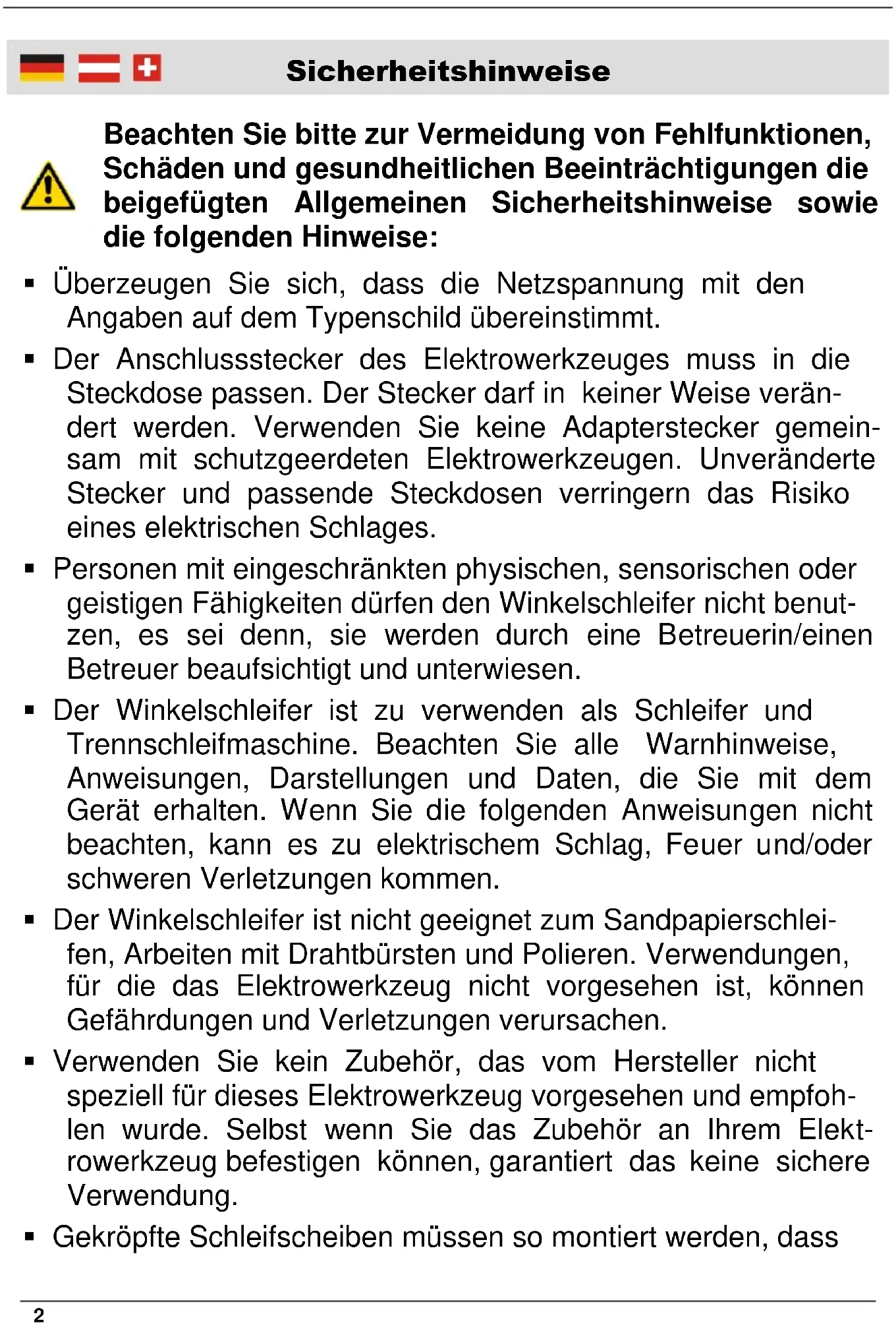 Schutzhaubenfixierung Safety Hood Locking Lever1 Safety Notes ........................................................................... Page 10 Before first Use ....................................................................... Page 36 Intended Use .......................................................................... Page 36 Setup ...................................................................................... Page 36 Attaching the Auxiliary Handle ................................................ Page 36 Inserting/Changing the Grinding Disc ..................................... Page 36 Using the Safety Hood for Grinding Discs ............................... Page 37 Using the Safety Hood for Cutting Discs ................................. Page 38 ON/OFF Switch ...................................................................... Page 38 Speed Regulator ..................................................................... Page 39 Hints for Operation.................................................................. Page 39 Carbon brushes ...................................................................... Page 39 Maintenance and Cleaning ..................................................... Page 40 Technical Data ....................................................................... Page 41 Sicherheitshinweise ................................................................ Seite 2 Vor der ersten Benutzung ....................................................... Seite 30 Bestimmungsgemäßer Gebrauch ........................................... Seite 30 Inbetriebnahme ....................................................................... Seite 30 Montage des Zusatzhandgriffes .............................................. Seite 30 Einsetzen/Auswechseln der Schleifscheibe ............................ Seite 30 Benutzung der Schleifscheiben-Schutzhaube ......................... Seite 32 Benutzung der Trennscheiben-Schutzhaube .......................... Seite 32 EIN/AUS-Schalter ................................................................... Seite 33 Geschwindigkeitsregler ........................................................... Seite 33 Hinweise zum Betrieb ............................................................. Seite 33 Schleifkohlen .......................................................................... Seite 34 Wartung und Reinigung .......................................................... Seite 34 Technische Daten ................................................................... Seite 35 Table of Contents Inhaltsverzeichnis2 Sicherheitshinweise Überzeugen Sie sich, dass die Netzspannung mit den Angaben auf dem Typenschild übereinstimmt. Der Anschlussstecker des Elektrowerkzeuges muss in die Steckdose passen. Der Stecker darf in keiner Weise verän- dert werden. Verwenden Sie keine Adapterstecker gemein- sam mit schutzgeerdeten Elektrowerkzeugen. Unveränderte Stecker und passende Steckdosen verringern das Risiko eines elektrischen Schlages. Personen mit eingeschränkten physischen, sensorischen oder geistigen Fähigkeiten dürfen den Winkelschleifer nicht benut- zen, es sei denn, sie werden durch eine Betreuerin/einen Betreuer beaufsichtigt und unterwiesen. Der Winkelschleifer ist zu verwenden als Schleifer und Trennschleifmaschine. Beachten Sie alle Warnhinweise, Anweisungen, Darstellungen und Daten, die Sie mit dem Gerät erhalten. Wenn Sie die folgenden Anweisungen nicht beachten, kann es zu elektrischem Schlag, Feuer und/oder schweren Verletzungen kommen. Der Winkelschleifer ist nicht geeignet zum Sandpapierschlei- fen, Arbeiten mit Drahtbürsten und Polieren. Verwendungen, für die das Elektrowerkzeug nicht vorgesehen ist, können Gefährdungen und Verletzungen verursachen. Verwenden Sie kein Zubehör, das vom Hersteller nicht speziell für dieses Elektrowerkzeug vorgesehen und empfoh- len wurde. Selbst wenn Sie das Zubehör an Ihrem Elekt- rowerkzeug befestigen können, garantiert das keine sichere Verwendung. Gekröpfte Schleifscheiben müssen so montiert werden, dass