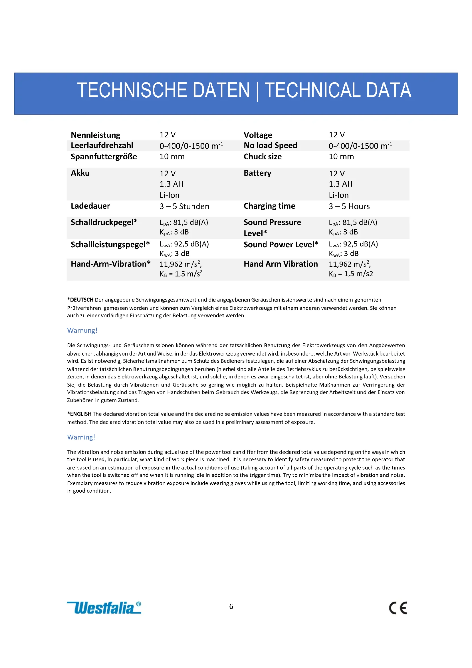 Li-Ion Ladedauer 3 – 5 Stunden Charging time 3 – 5 Hours Schalldruckpegel*
