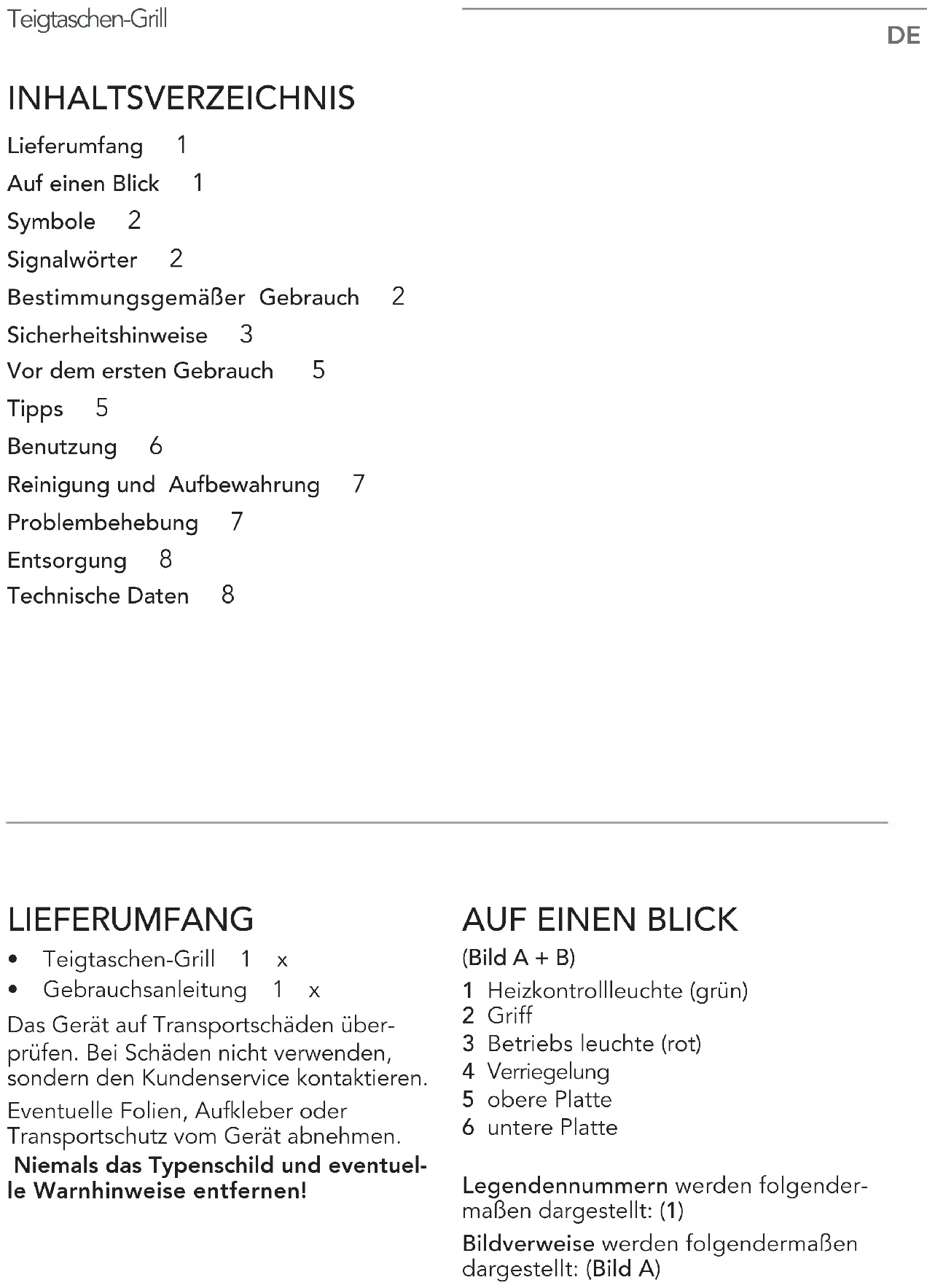 GEFAHR – Stromschlaggefahr ■ Das Gerät nur in geschlossenen Räu- men verwenden. ■ Das Gerät nicht in Räumen mit hoher Luftfeuchtigkeit verwenden. ■ Das Gerät und die Anschlussleitung niemals in Wasser oder andere Flüs- sigkeiten eintauchen und sicherstel- len, dass diese Komponenten nicht ins Wasser fallen oder nass werden können. ■ Sollte das Gerät ins Wasser fallen, während es an das Stromnetz ange- schlossen ist, sofort die Stromzufuhr unterbrechen. Erst danach das Gerät aus dem Wasser ziehen! ■ Das Gerät und die Anschlussleitung niemals mit feuchten Händen berüh- ren, wenn das Gerät an das Strom- netz angeschlossen ist. ■ Das Gerät nicht verwenden, wenn es eine Fehlfunktion hatte, herunterge- fallen oder ins Wasser gefallen ist. Vor erneuter Inbetriebnahme in einer Fachwerkstatt überprüfen lassen. WARNUNG – Brandgefahr ■ Das Gerät nicht zusammen mit ande- ren Verbrauchern (mit hoher Watt- leistung) an eine Mehrfachsteckdose anschließen, um eine Überlastung und ggf. einen Kurzschluss (Brand) zu vermeiden. ■ Das Gerät nicht in Verbindung mit Verlängerungskabeln nutzen. ■ Das Gerät nicht in der Nähe von brennbarem Material betreiben. Keine brennbaren oder leicht schmel- zenden Materialien (z. B. Pappe, Papier, Holz, Kunststoff) in oder auf das Gerät legen. ■ Das Gerät während des Betriebes nicht abdecken, um einen Geräte- brand zu vermeiden. ■ Für ausreichende Belüftung sorgen, während das Gerät in Betrieb ist. ■ Das Gerät nicht als Heizung ver- wenden. ■ Im Brandfall: Nicht mit Wasser löschen! Flammen mit einer feuer- festen Decke oder einem geeigneten Feuerlöscher ersticken. WARNUNG – Verletzungs- gefahr ■ Das Verpackungsmaterial von Kindern und Tieren fernhalten. Es besteht Erstickungsgefahr. ■ Sicherstellen, dass die Anschluss- leitung stets außer Reichweite von Kleinkindern und Tieren ist. Es be- steht Strangulationsgefahr. ■ Während des Betriebes kann heißer Dampf aus dem Gerät austreten. Kopf und Hände daher aus der Gefahrenzone fernhalten. Es besteht Verbrühungsgefahr durch Hitze und heißen Dampf. ■ Die Platten des Gerätes werden sehr heiß. Beim Befüllen und Entnehmen der Lebensmittel vorsichtig sein! Hitzebständige Küchenuntensilien verwenden. Es besteht Verbren- nungsgefahr. ■ Das Gerät darf während des Betrie- bes nicht bewegt werden. Es besteht Verbrennungsgefahr. ■ Darauf achten, dass die Anschluss- leitung keine Stolpergefahr darstellt. Sie darf nicht von der Aufstellfl äche herabhängen, um ein Herunterreißen des Gerätes zu verhindern.Teigtaschen-Grill
