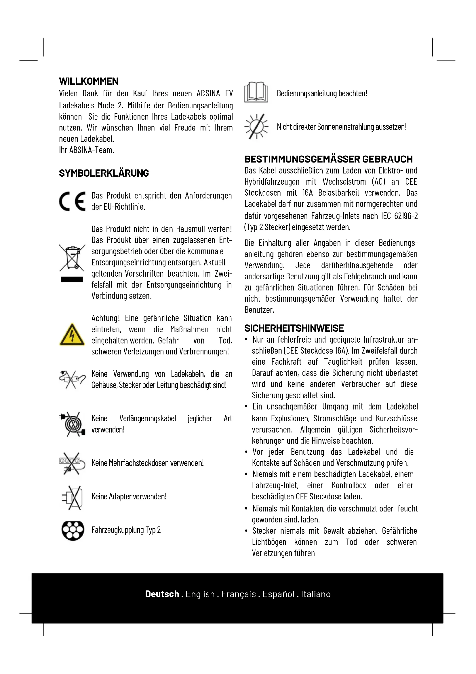 - Stecker niemals mit Gewalt abziehen. Gefährliche Lichtbögen können zum Tod oder schweren Verletzungen führen WILLKOMMEN Vielen Dank für den Kauf Ihres neuen ABSINA EV Ladekabels Mode 2. Mithilfe der Bedienungsanleitung können Sie die Funktionen Ihres Ladekabels optimal nutzen. Wir wünschen Ihnen viel Freude mit Ihrem neuen Ladekabel. Ihr ABSINA-Team. SYMBOLERKLÄRUNG Das Produkt entspricht den Anforderungen der EU-Richtlinie. Das Produkt nicht in den Hausmüll werfen! Das Produkt über einen zugelassenen Ent- sorgungsbetrieb oder über die kommunale Entsorgungseinrichtung entsorgen. Aktuell geltenden Vorschriften beachten. Im Zwei- felsfall mit der Entsorgungseinrichtung in Verbindung setzen. Achtung! Eine gefährliche Situation kann eintreten, wenn die Maßnahmen nicht eingehalten werden. Gefahr von Tod, schweren Verletzungen und Verbrennungen! Keine Verwendung von Ladekabeln, die an Gehäuse, Stecker oder Leitung beschädigt sind! Keine Verlängerungskabel jeglicher Art verwenden! Keine Mehrfachsteckdosen verwenden! Keine Adapter verwenden! Fahrzeugkupplung Typ 2 Deutsch . English . Français . Español . ItalianoCEE