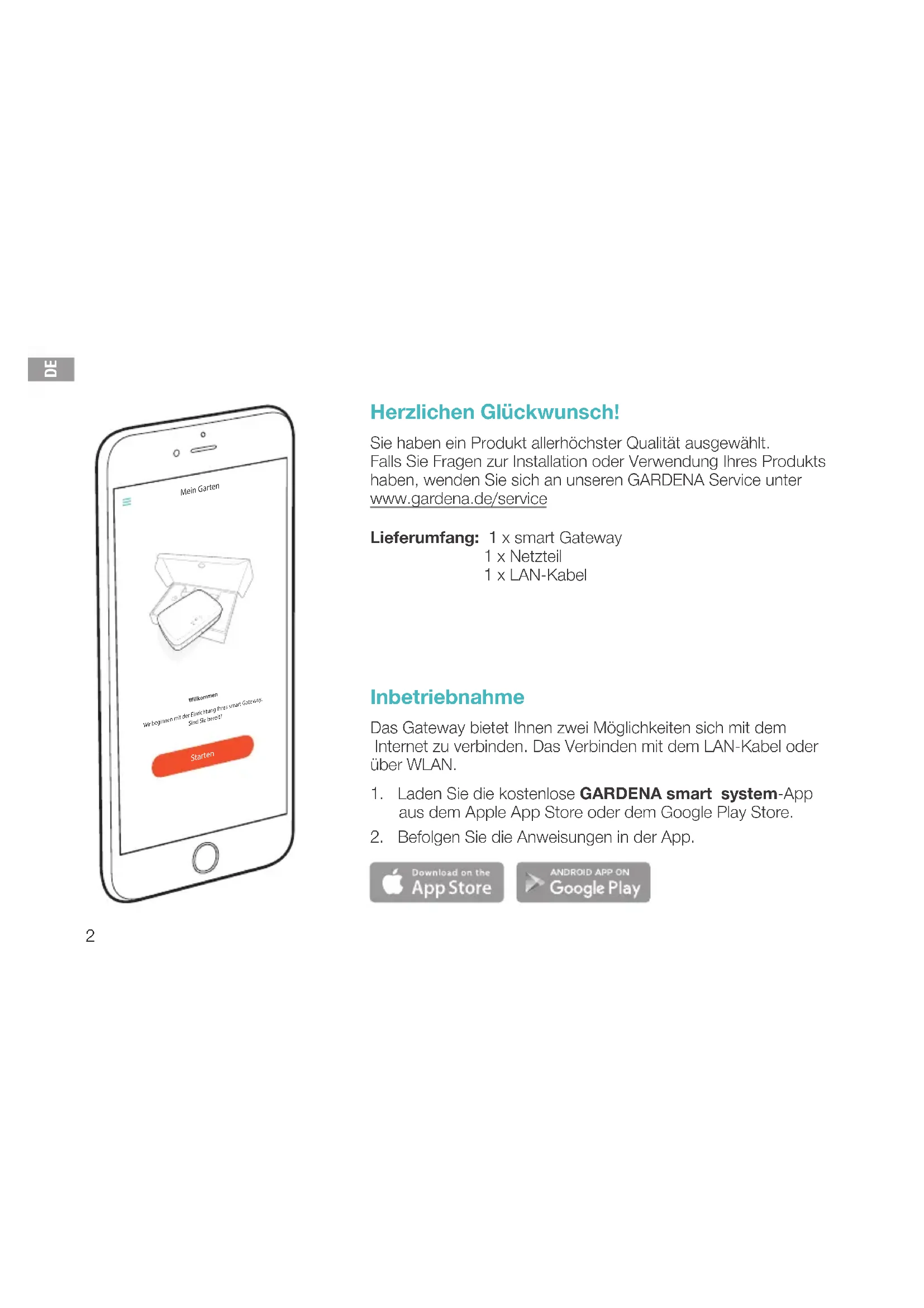 Herzlichen Glückwunsch! Sie haben ein Produkt allerhöchster Qualität ausgewählt. Falls Sie Fragen zur Installation oder Verwendung Ihres Produkts haben, wenden Sie sich an unseren GARDENA Service unter www.gardena.de/service Lieferumfang: 1 x smart Gateway 1 x Netzteil 1 x LAN-Kabel Inbetriebnahme Das Gateway bietet Ihnen zwei Möglichkeiten sich mit dem Internet zu verbinden. Das Verbinden mit dem LAN-Kabel oder über WLAN.