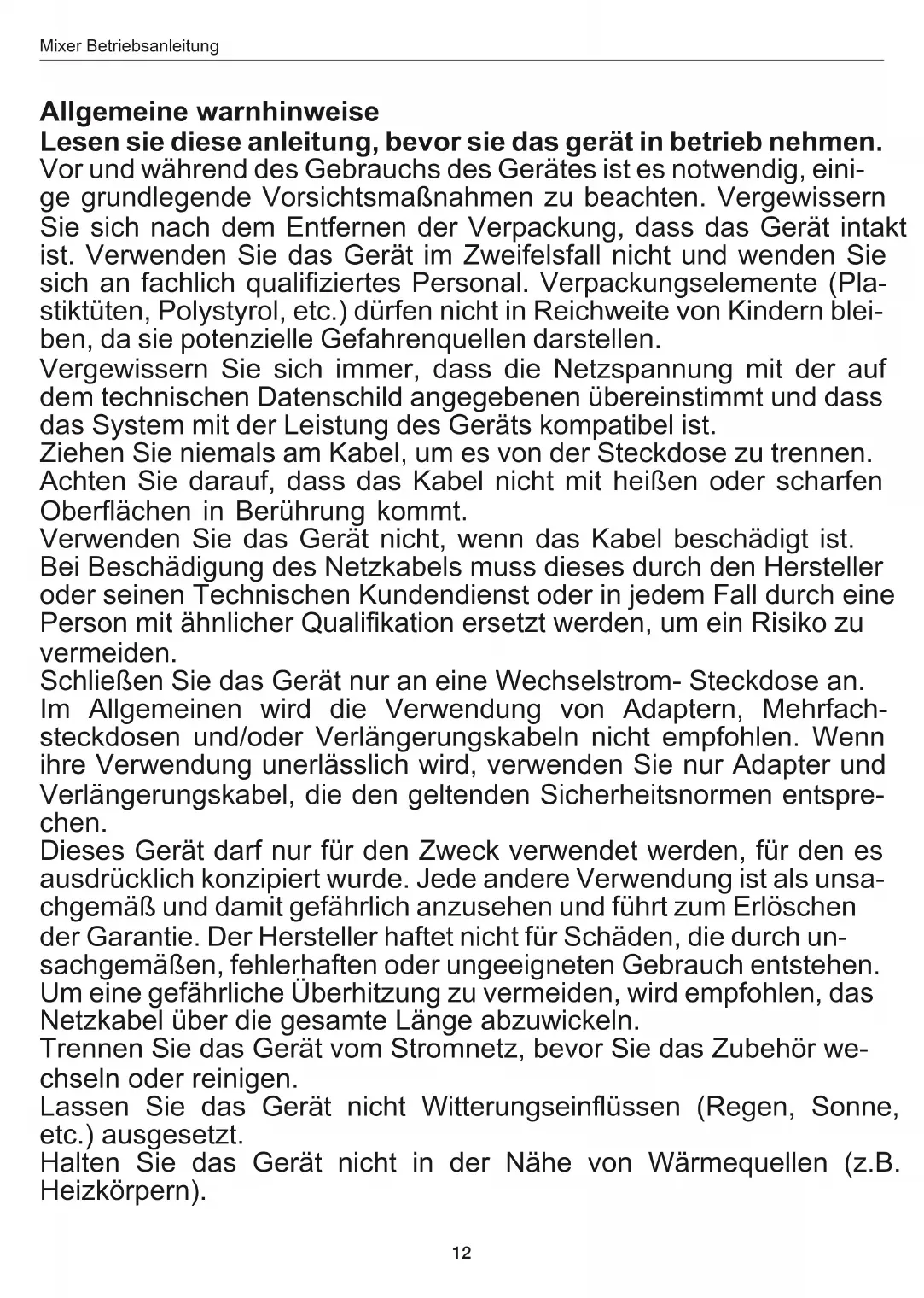 Allgemeine warnhinweise Lesen sie diese anleitung, bevor sie das gerät in betrieb nehmen. Vor und während des Gebrauchs des Gerätes ist es notwendig, eini- ge grundlegende Vorsichtsmaßnahmen zu beachten. Vergewissern Sie sich nach dem Entfernen der Verpackung, dass das Gerät intakt ist. Verwenden Sie das Gerät im Zweifelsfall nicht und wenden Sie sich an fachlich qualiziertes Personal. Verpackungselemente (Pla- stiktüten, Polystyrol, etc.) dürfen nicht in Reichweite von Kindern blei- ben, da sie potenzielle Gefahrenquellen darstellen. Vergewissern Sie sich immer, dass die Netzspannung mit der auf dem technischen Datenschild angegebenen übereinstimmt und dass das System mit der Leistung des Geräts kompatibel ist. Ziehen Sie niemals am Kabel, um es von der Steckdose zu trennen. Achten Sie darauf, dass das Kabel nicht mit heißen oder scharfen Oberächen in Berührung kommt. Verwenden Sie das Gerät nicht, wenn das Kabel beschädigt ist. Bei Beschädigung des Netzkabels muss dieses durch den Hersteller oder seinen Technischen Kundendienst oder in jedem Fall durch eine Person mit ähnlicher Qualikation ersetzt werden, um ein Risiko zu vermeiden. Schließen Sie das Gerät nur an eine Wechselstrom- Steckdose an. Im Allgemeinen wird die Verwendung von Adaptern, Mehrfach- steckdosen und/oder Verlängerungskabeln nicht empfohlen. Wenn ihre Verwendung unerlässlich wird, verwenden Sie nur Adapter und Verlängerungskabel, die den geltenden Sicherheitsnormen entspre- chen. Dieses Gerät darf nur für den Zweck verwendet werden, für den es ausdrücklich konzipiert wurde. Jede andere Verwendung ist als unsa- chgemäß und damit gefährlich anzusehen und führt zum Erlöschen der Garantie. Der Hersteller haftet nicht für Schäden, die durch un- sachgemäßen, fehlerhaften oder ungeeigneten Gebrauch entstehen. Um eine gefährliche Überhitzung zu vermeiden, wird empfohlen, das Netzkabel über die gesamte Länge abzuwickeln. Trennen Sie das Gerät vom Stromnetz, bevor Sie das Zubehör we- chseln oder reinigen. Lassen Sie das Gerät nicht Witterungseinüssen (Regen, Sonne, etc.) ausgesetzt. Halten Sie das Gerät nicht in der Nähe von Wärmequellen (z.B. Heizkörpern).Mixer Betriebsanleitung
