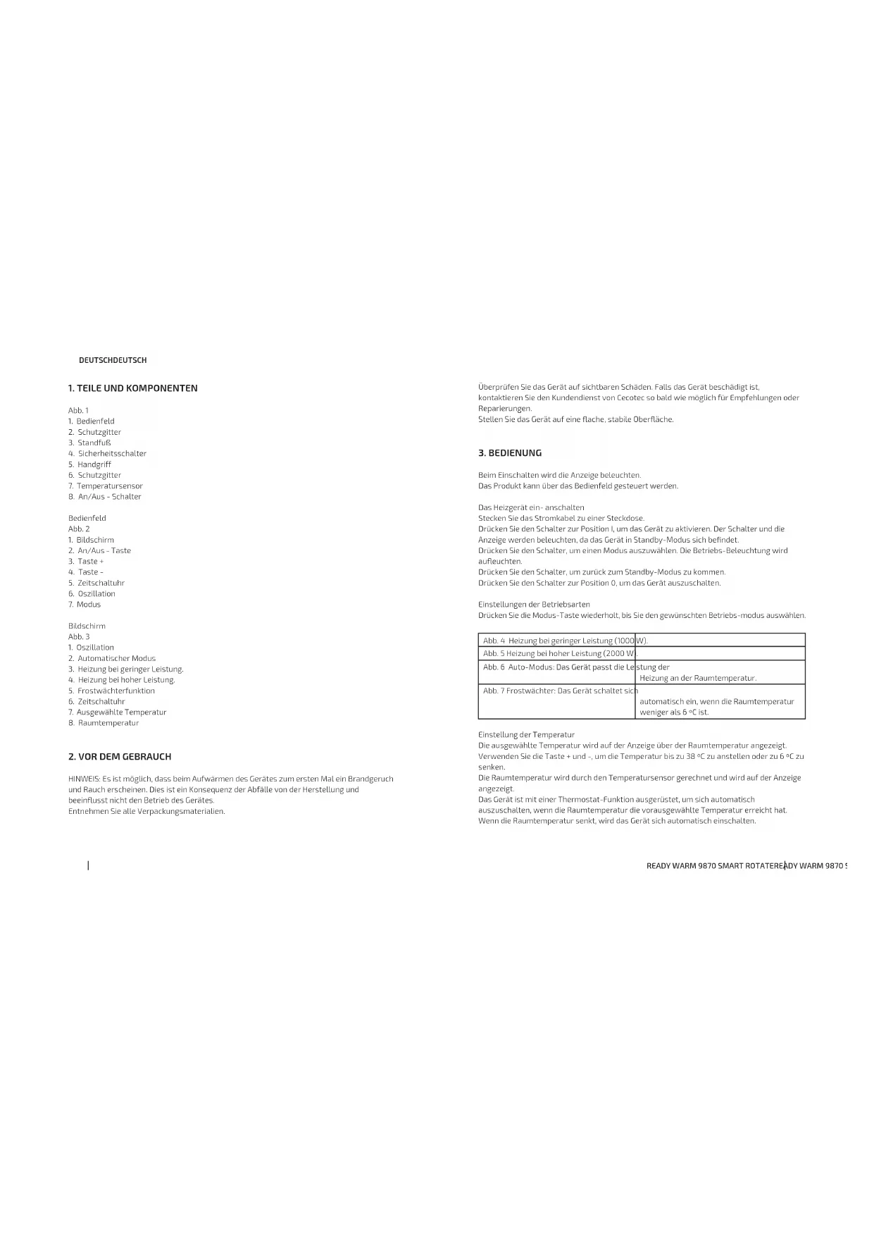 HINWEIS: Es ist möglich, dass beim Aufwärmen des Gerätes zum ersten Mal ein Brandgeruch und Rauch erscheinen. Dies ist ein Konsequenz der Abfälle von der Herstellung und beeinusst nicht den Betrieb des Gerätes. Entnehmen Sie alle Verpackungsmaterialien.READY WARM 9870 SMART ROTATEREADY WARM 9870 SMART ROTATE 3736 DEUTSCH DEUTSCH Wenn das Heizgerät für eine lange Zeit nicht verwandt wird, lagern Sie es in einem trocknen, sicheren Ort, weit vom Staub.