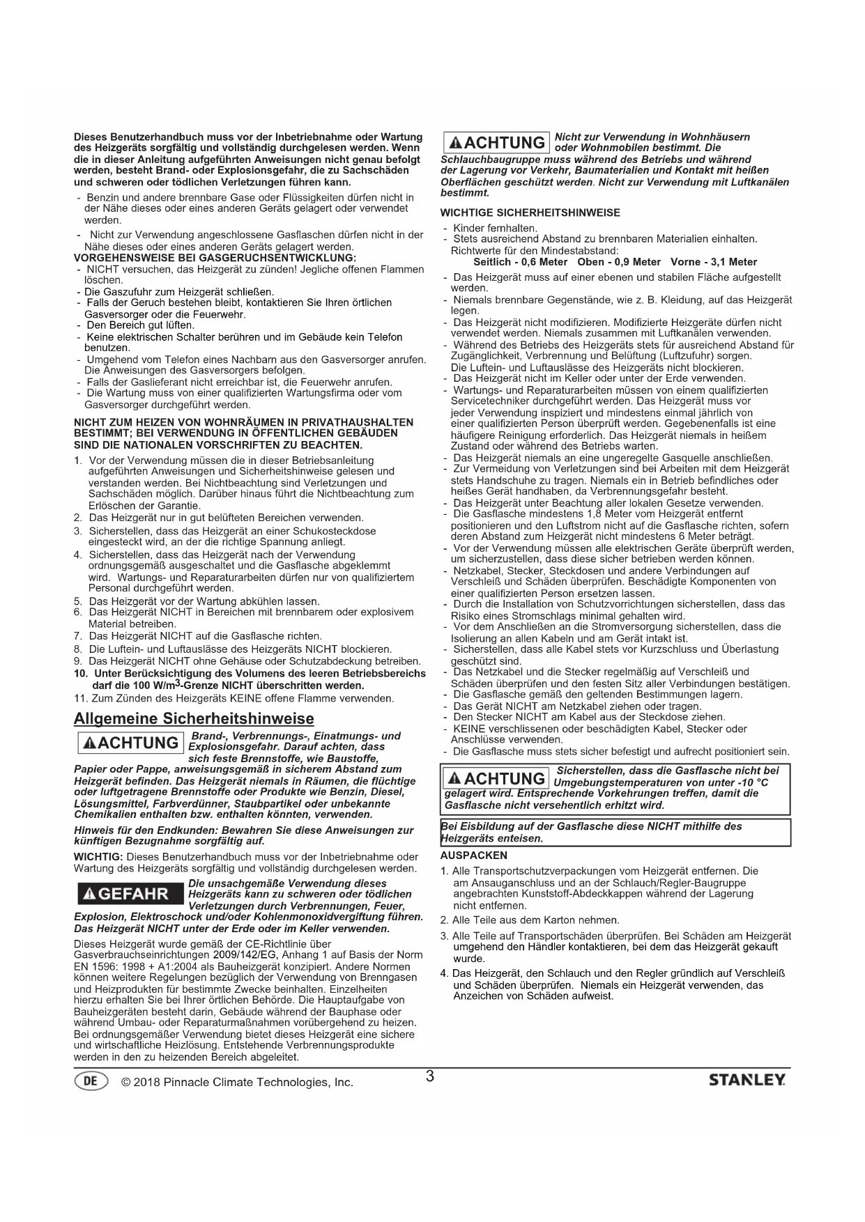 YN. GELB© 2018 Pinnacle Climate Technologies, Inc. Dieses Benutzerhandbuch muss vor der Inbetriebnahme oder Wartung des Heizgeräts sorgfältig und vollständig durchgelesen werden. Wenn die in dieser Anleitung aufgeführten Anweisungen nicht genau befolgt werden, besteht Brand- oder Explosionsgefahr, die zu Sachschäden und schweren oder tödlichen Verletzungen führen kann. - Benzin und andere brennbare Gase oder Flüssigkeiten dürfen nicht in der Nähe dieses oder eines anderen Geräts gelagert oder verwendet werden. - Nicht zur Verwendung angeschlossene Gasflaschen dürfen nicht in der Nähe dieses oder eines anderen Geräts gelagert werden. VORGEHENSWEISE BEI GASGERUCHSENTWICKLUNG: - NICHT versuchen, das Heizgerät zu zünden! Jegliche offenen Flammen löschen.