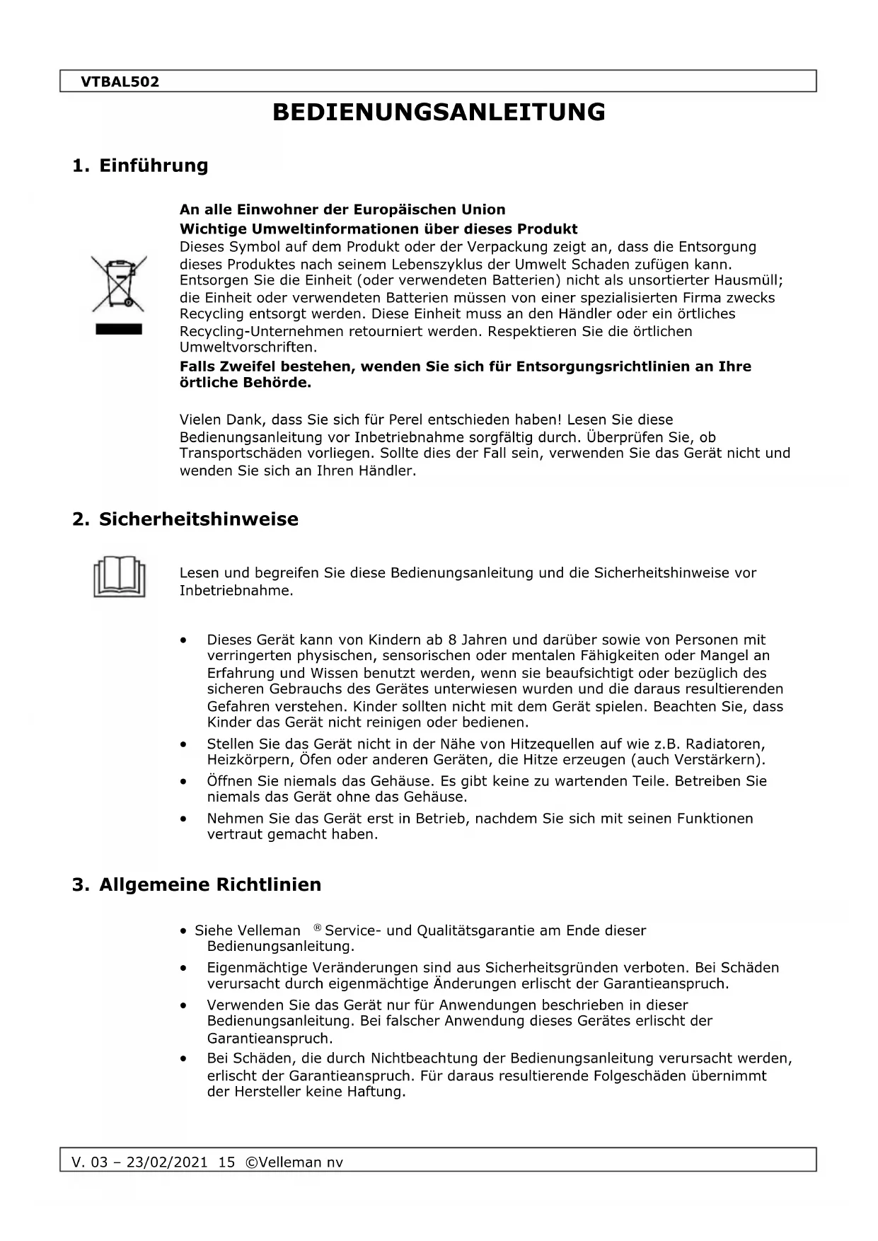 - Bei Schäden, die durch Nichtbeachtung der Bedienungsanleitung verursacht werden, erlischt der Garantieanspruch. Für daraus resultierende Folgeschäden übernimmt der Hersteller keine Haftung.VTBAL502