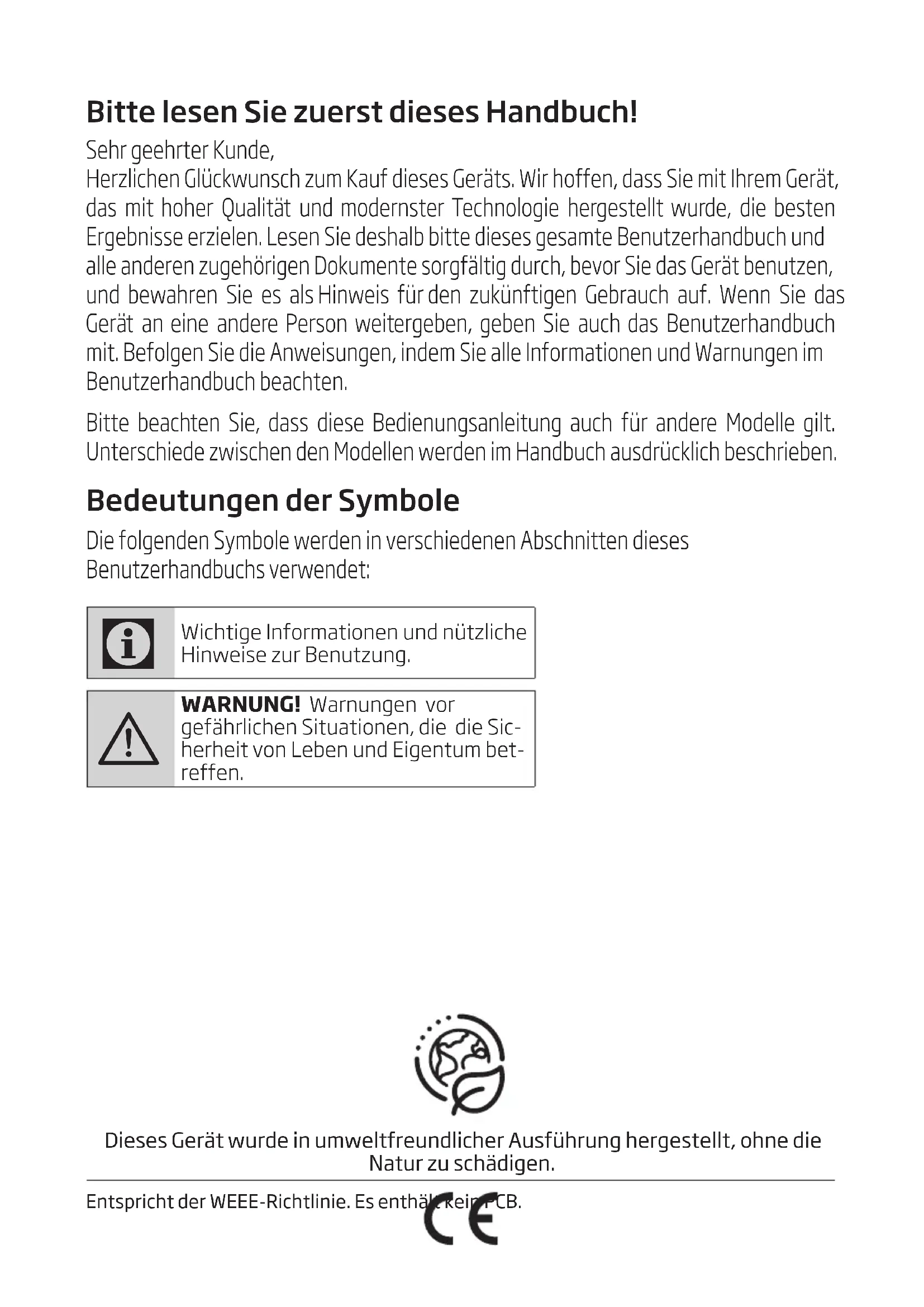Technical Data Manufacturer: Zhuhai RHEIN Electronic Technology Co.,Ltd Address: Rm 410-411 Bldg 20th No.1889 East Huandao Rd, Hengqin New District, Zhuhai, Guangdong China 519000 Importer: Arcelik A.S. Address: Arcelik A.S. Karaagac Cd. No:2-6 34445 Sutluce, Beyoglu, Istanbul, Turkey SDA-HVAC-01-21-06Bitte lesen Sie zuerst dieses Handbuch! Sehr geehrter Kunde, Herzlichen Glückwunsch zum Kauf dieses Geräts. Wir hoffen, dass Sie mit Ihrem Gerät, das mit hoher Qualität und modernster Technologie hergestellt wurde, die besten Ergebnisse erzielen. Lesen Sie deshalb bitte dieses gesamte Benutzerhandbuch und alle anderen zugehörigen Dokumente sorgfältig durch, bevor Sie das Gerät benutzen, und bewahren Sie es als Hinweis für den zukünftigen Gebrauch auf. Wenn Sie das Gerät an eine andere Person weitergeben, geben Sie auch das Benutzerhandbuch mit. Befolgen Sie die Anweisungen, indem Sie alle Informationen und Warnungen im Benutzerhandbuch beachten. Bitte beachten Sie, dass diese Bedienungsanleitung auch für andere Modelle gilt. Unterschiede zwischen den Modellen werden im Handbuch ausdrücklich beschrieben. Bedeutungen der Symbole Die folgenden Symbole werden in verschiedenen Abschnitten dieses Benutzerhandbuchs verwendet: