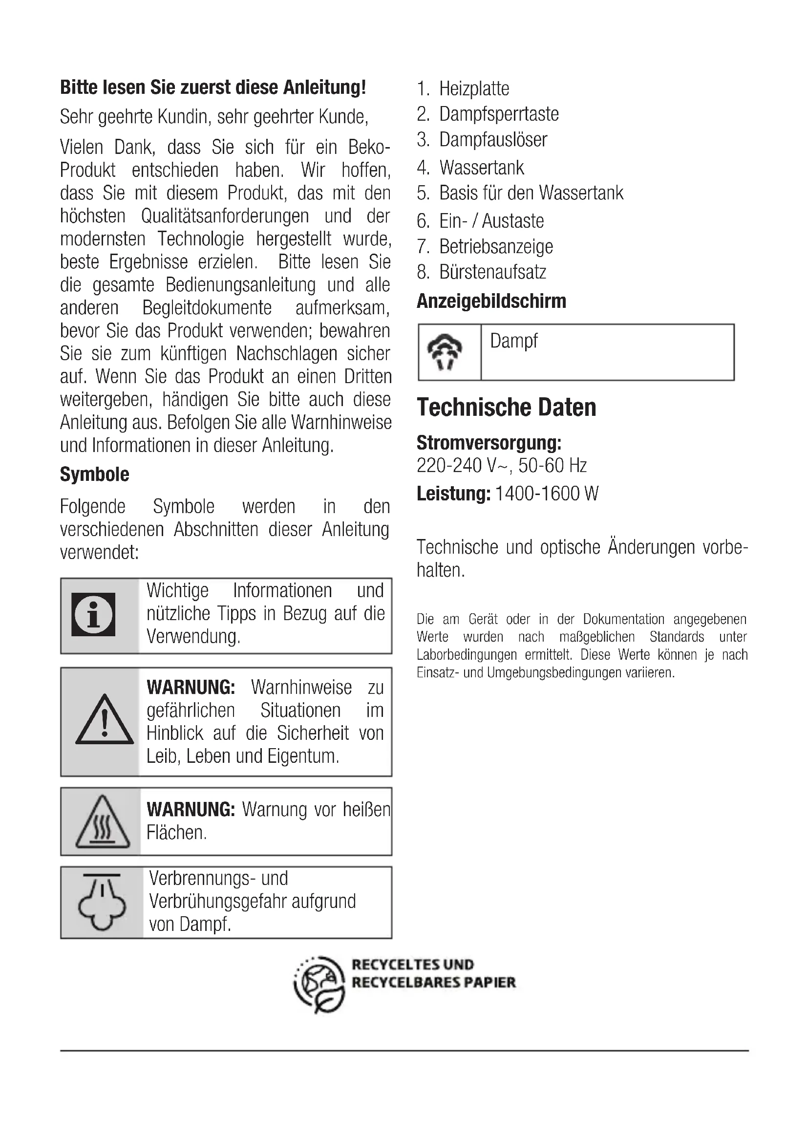 - Be cautious and steam around the metal accessories. 4 TroubleshootingBitte lesen Sie zuerst diese Anleitung! Sehr geehrte Kundin, sehr geehrter Kunde, Vielen Dank, dass Sie sich für ein Beko- Produkt entschieden haben. Wir hoffen, dass Sie mit diesem Produkt, das mit den höchsten Qualitätsanforderungen und der modernsten Technologie hergestellt wurde, beste Ergebnisse erzielen. Bitte lesen Sie die gesamte Bedienungsanleitung und alle anderen Begleitdokumente aufmerksam, bevor Sie das Produkt verwenden; bewahren Sie sie zum künftigen Nachschlagen sicher auf. Wenn Sie das Produkt an einen Dritten weitergeben, händigen Sie bitte auch diese Anleitung aus. Befolgen Sie alle Warnhinweise und Informationen in dieser Anleitung. Symbole Folgende Symbole werden in den verschiedenen Abschnitten dieser Anleitung verwendet: