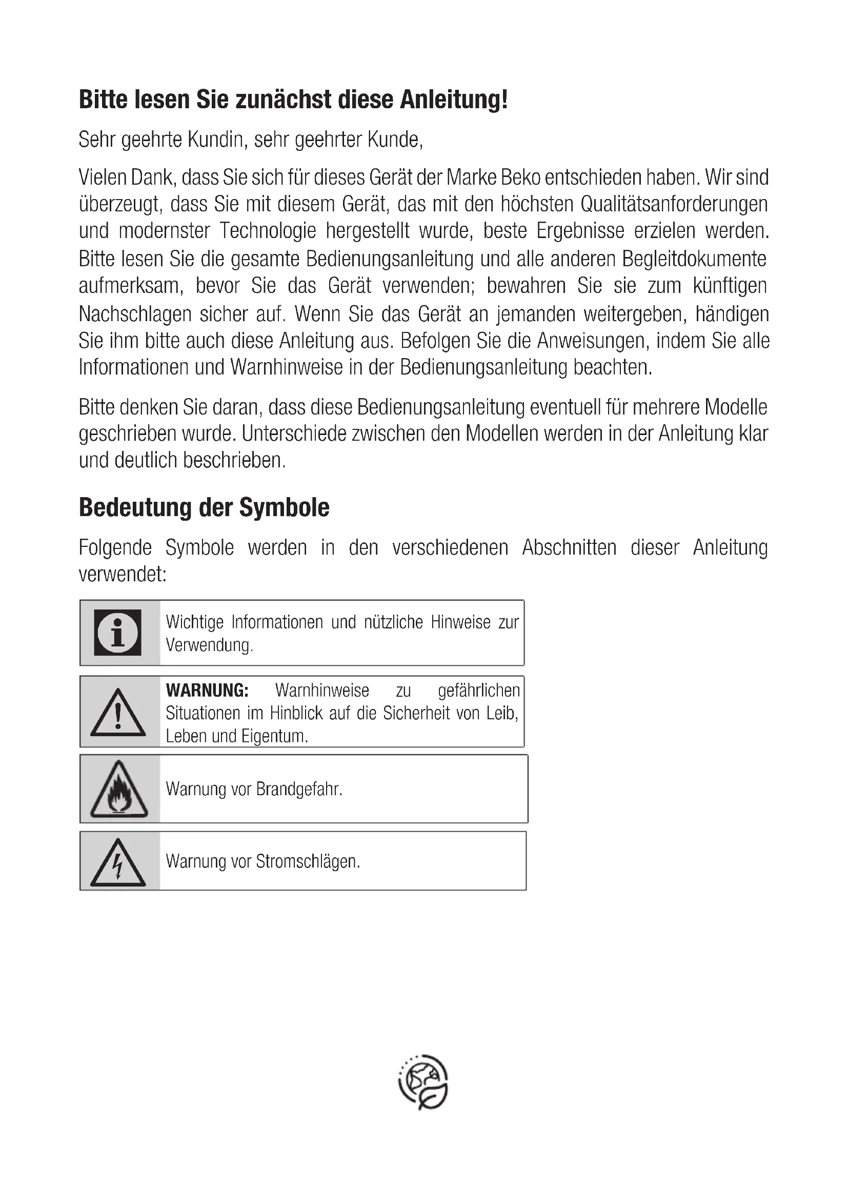 - Dropping the appliance will render it non- operational or cause permanent damage.Bitte lesen Sie zunächst diese Anleitung! Sehr geehrte Kundin, sehr geehrter Kunde, Vielen Dank, dass Sie sich für dieses Gerät der Marke Beko entschieden haben. Wir sind überzeugt, dass Sie mit diesem Gerät, das mit den höchsten Qualitätsanforderungen und modernster Technologie hergestellt wurde, beste Ergebnisse erzielen werden. Bitte lesen Sie die gesamte Bedienungsanleitung und alle anderen Begleitdokumente aufmerksam, bevor Sie das Gerät verwenden; bewahren Sie sie zum künftigen Nachschlagen sicher auf. Wenn Sie das Gerät an jemanden weitergeben, händigen Sie ihm bitte auch diese Anleitung aus. Befolgen Sie die Anweisungen, indem Sie alle Informationen und Warnhinweise in der Bedienungsanleitung beachten. Bitte denken Sie daran, dass diese Bedienungsanleitung eventuell für mehrere Modelle geschrieben wurde. Unterschiede zwischen den Modellen werden in der Anleitung klar und deutlich beschrieben. Bedeutung der Symbole Folgende Symbole werden in den verschiedenen Abschnitten dieser Anleitung verwendet: