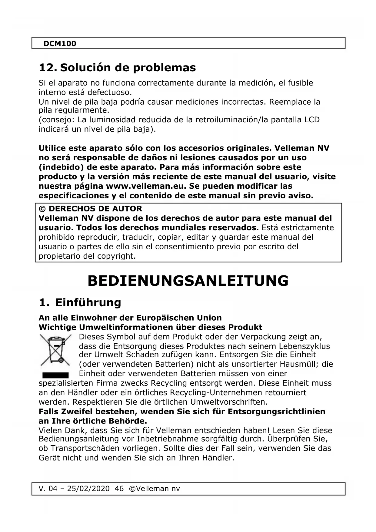 Funktioniert das Gerät beim Messen nicht mehr korrekt, dann ist die interne Sicherung defekt. Eine schwache Batterie kann zu ungenauen Messergebnissen führen. Ersetzen Sie Batterie regelmäßig. (Hinweis: Verringert sich die Intensität der Hintergrundbeleuchtung/des LCD-Displays, dann ist die Batterie schwach) Verwenden Sie dieses Gerät nur mit originellen Zubehörteilen. Velleman NV übernimmt keine Haftung für Schaden oder Verletzungen bei (falscher) Anwendung dieses Gerätes. Mehr Informationen zu diesem Produkt und die neueste Version dieser Bedienungsanleitung finden Sie hier: www.velleman.eu. Alle Änderungen ohne vorherige Ankündigung vorbehalten. © URHEBERRECHT Velleman NV besitzt das Urheberrecht für diese Bedienungsanleitung. Alle weltweiten Rechte vorbehalten. Ohne vorherige schriftliche Genehmigung des Urhebers ist es nicht gestattet, diese Bedienungsanleitung ganz oder in Teilen zu reproduzieren, zu kopieren, zu übersetzen, zu bearbeiten oder zu speichern.DCM100
