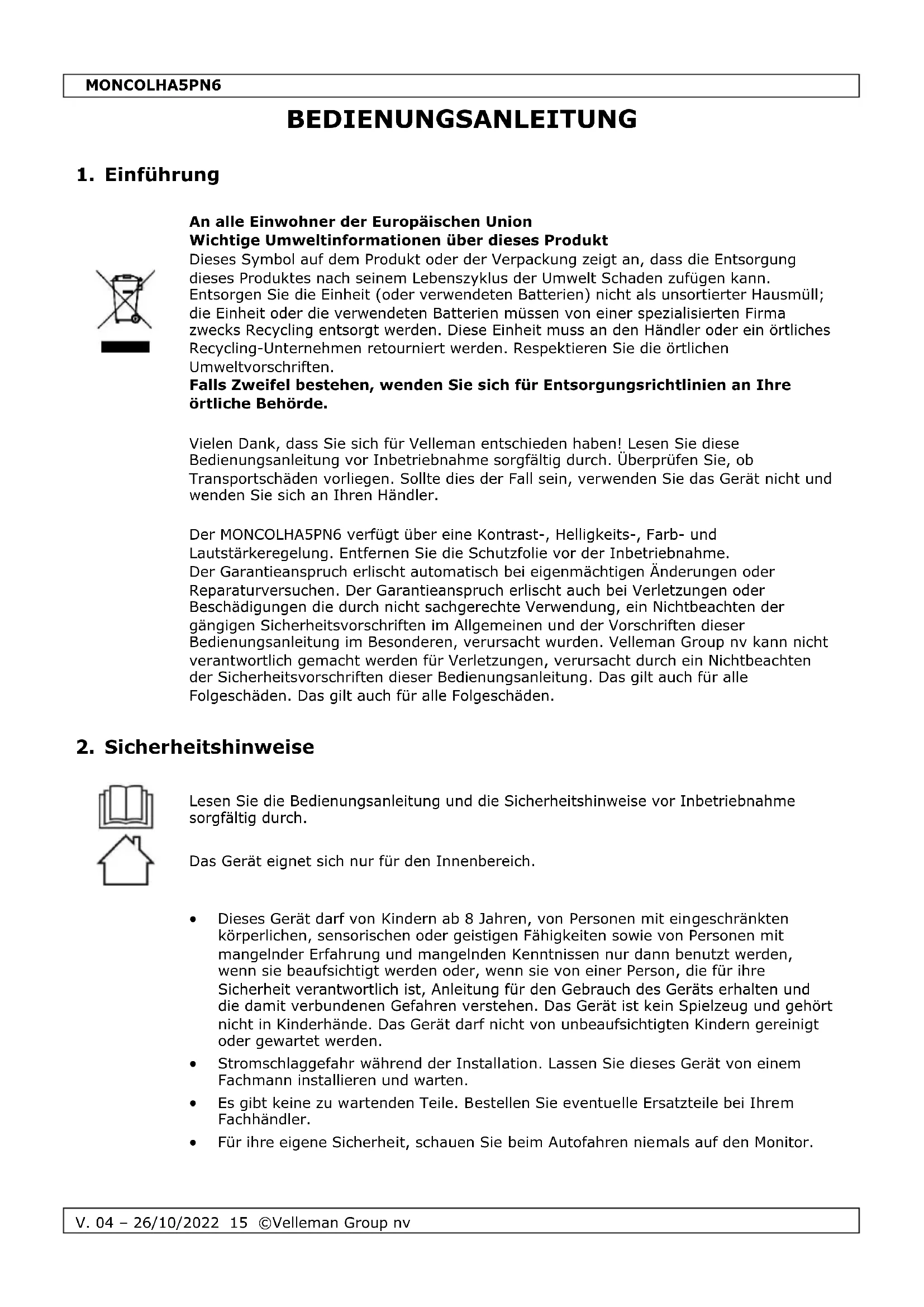 Velleman Group nv besitzt das Urheberrecht für diese Bedienungsanleitung. Alle weltweiten Rechte vorbehalten. Ohne vorherige schriftliche Genehmigung des Urhebers ist es nicht gestattet, diese Bedienungsanleitung ganz oder in Teilen zu reproduzieren, zu kopieren, zu übersetzen, zu bearbeiten oder zu speichern.MONCOLHA5PN6