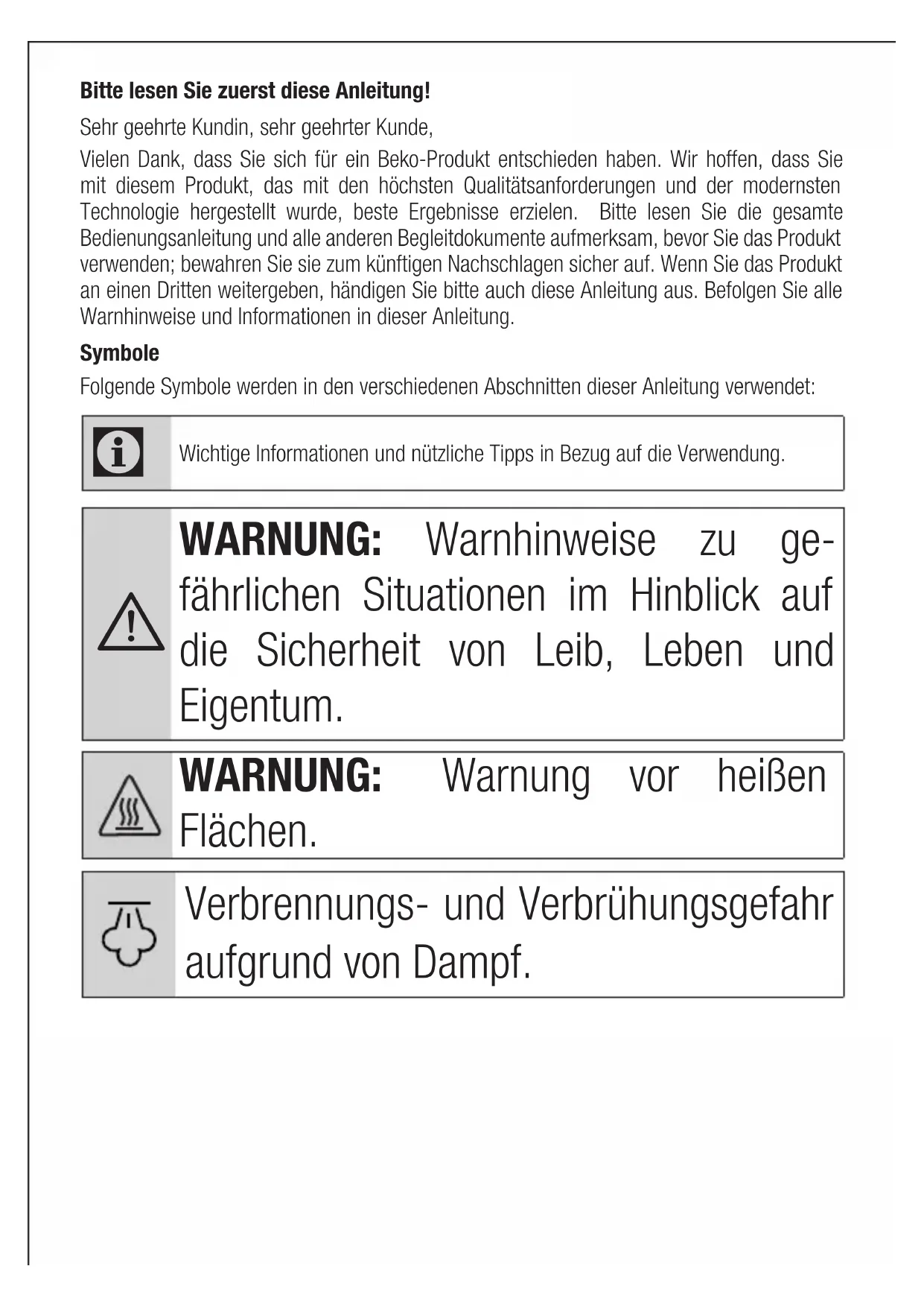 - Be cautious and steam around the metal accessories. 4 TroubleshootingBitte lesen Sie zuerst diese Anleitung! Sehr geehrte Kundin, sehr geehrter Kunde, Vielen Dank, dass Sie sich für ein Beko-Produkt entschieden haben. Wir hoffen, dass Sie mit diesem Produkt, das mit den höchsten Qualitätsanforderungen und der modernsten Technologie hergestellt wurde, beste Ergebnisse erzielen. Bitte lesen Sie die gesamte Bedienungsanleitung und alle anderen Begleitdokumente aufmerksam, bevor Sie das Produkt verwenden; bewahren Sie sie zum künftigen Nachschlagen sicher auf. Wenn Sie das Produkt an einen Dritten weitergeben, händigen Sie bitte auch diese Anleitung aus. Befolgen Sie alle Warnhinweise und Informationen in dieser Anleitung. Symbole Folgende Symbole werden in den verschiedenen Abschnitten dieser Anleitung verwendet: