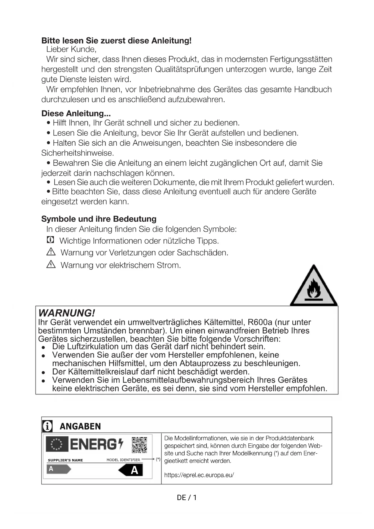 - Bitte beachten Sie, dass diese Anleitung eventuell auch für andere Geräte eingesetzt werden kann. Symbole und ihre Bedeutung In dieser Anleitung finden Sie die folgenden Symbole: C Wichtige Informationen oder nützliche Tipps. A Warnung vor Verletzungen oder Sachschäden. B Warnung vor elektrischem Strom. WARNUNG! Ihr Gerät verwendet ein umweltverträgliches Kältemittel, R600a (nur unter bestimmten Umständen brennbar). Um einen einwandfreien Betrieb Ihres Gerätes sicherzustellen, beachten Sie bitte folgende Vorschriften: