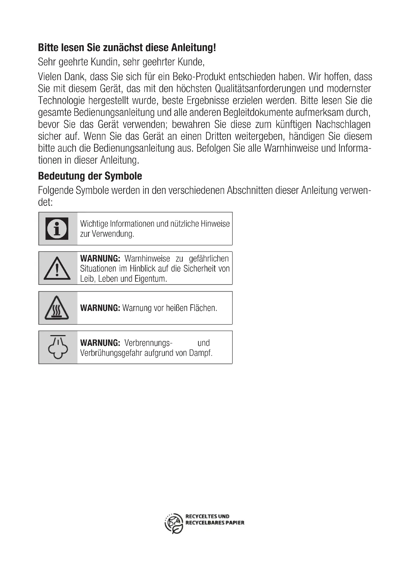 WARNUNG: Warnhinweise zu gefährlichen Situationen im Hinblick auf die Sicherheit von Leib, Leben und Eigentum. WARNUNG: Warnung vor heißen Flächen. WARNUNG: Verbrennungs- und Verbrühungsgefahr aufgrund von Dampf.20 / DE Dampfbügeleisen / Bedienungsanleitung Dieser Abschnitt enthält Sicherheitsanweisungen, die zum Schutz vor Personen- und Sachschäden beitragen. Bei Nichtbeachtung dieser Anweisungen erlischt die ge- währte Garantie.