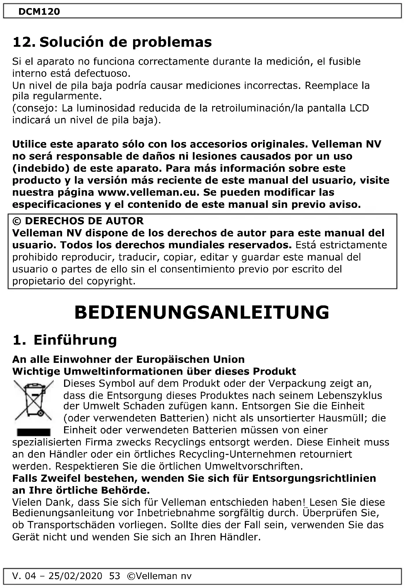 Funktioniert das Gerät beim Messen nicht mehr korrekt, dann ist die interne Sicherung defekt. Eine schwache Batterie kann zu ungenauen Messergebnissen führen. Ersetzen Sie Batterie regelmäßig. (Hinweis: Verringert sich die Intensität der Hintergrundbeleuchtung/des LCD-Displays, dann ist die Batterie schwach) Verwenden Sie dieses Gerät nur mit originellen Zubehörteilen. Velleman NV übernimmt keine Haftung für Schaden oder Verletzungen bei (falscher) Anwendung dieses Gerätes. Mehr Informationen zu diesem Produkt und die neueste Version dieser Bedienungsanleitung finden Sie hier: www.velleman.eu. Alle Änderungen ohne vorherige Ankündigung vorbehalten. © URHEBERRECHT Velleman NV besitzt das Urheberrecht für diese Bedienungsanleitung. Alle weltweiten Rechte vorbehalten. Ohne vorherige schriftliche Genehmigung des Urhebers ist es nicht gestattet, diese Bedienungsanleitung ganz oder in Teilen zu reproduzieren, zu kopieren, zu übersetzen, zu bearbeiten oder zu speichern.DCM120