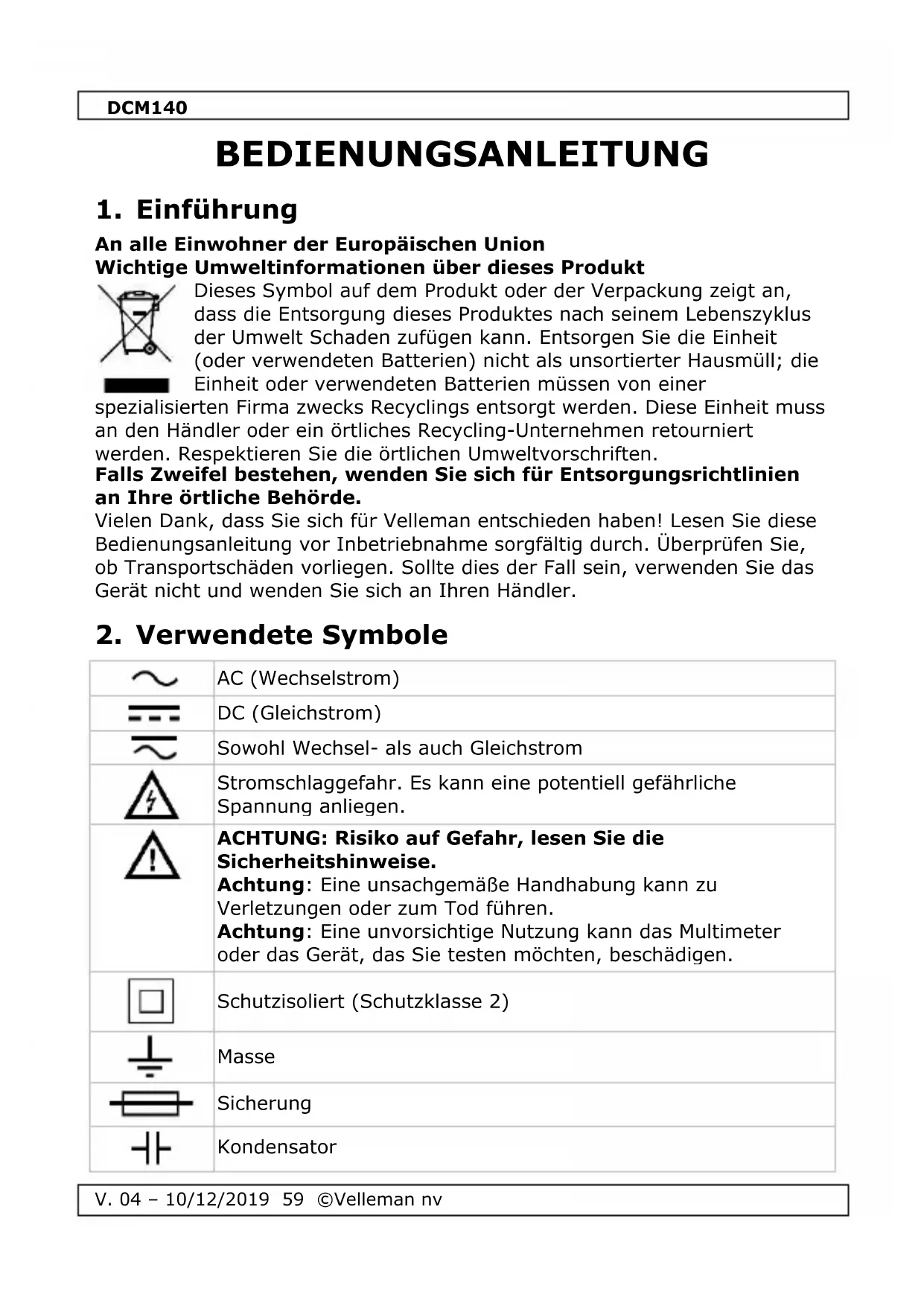 Funktioniert das Gerät beim Messen nicht mehr korrekt, dann ist die interne Sicherung defekt. Eine schwache Batterie kann zu ungenauen Messergebnissen führen. Ersetzen Sie Batterie regelmäßig. (Hinweis: Verringert sich die Intensität der Hintergrundbeleuchtung/des LCD-Displays, dann ist die Batterie schwach) Verwenden Sie dieses Gerät nur mit originellen Zubehörteilen. Velleman NV übernimmt keine Haftung für Schaden oder Verletzungen bei (falscher) Anwendung dieses Gerätes. Mehr Informationen zu diesem Produkt und die neueste Version dieser Bedienungsanleitung finden Sie hier: www.velleman.eu. Alle Änderungen ohne vorherige Ankündigung vorbehalten. © URHEBERRECHT Velleman NV besitzt das Urheberrecht für diese Bedienungsanleitung. Alle weltweiten Rechte vorbehalten. Ohne vorherige schriftliche Genehmigung des Urhebers ist es nicht gestattet, diese Bedienungsanleitung ganz oder in Teilen zu reproduzieren, zu kopieren, zu übersetzen, zu bearbeiten oder zu speichern.