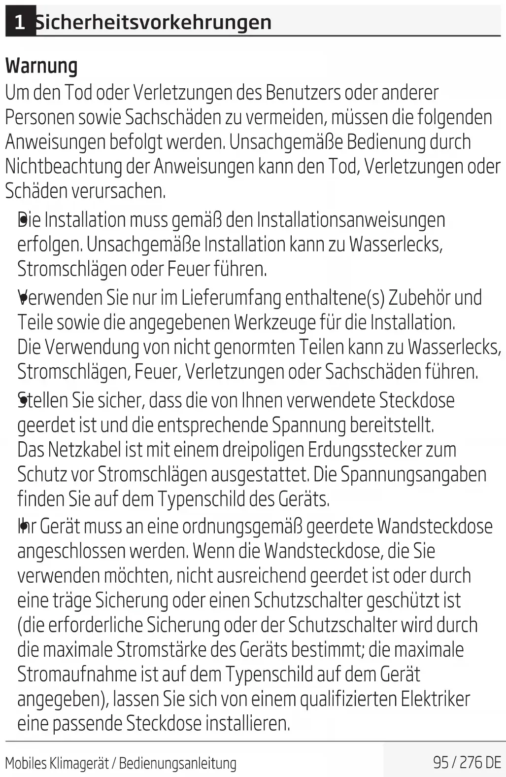 Ihr Gerät muss an eine ordnungsgemäß geerdete Wandsteckdose angeschlossen werden. Wenn die Wandsteckdose, die Sie verwenden möchten, nicht ausreichend geerdet ist oder durch eine träge Sicherung oder einen Schutzschalter geschützt ist (die erforderliche Sicherung oder der Schutzschalter wird durch die maximale Stromstärke des Geräts bestimmt; die maximale Stromaufnahme ist auf dem Typenschild auf dem Gerät angegeben), lassen Sie sich von einem qualifizierten Elektriker eine passende Steckdose installieren.96 / 276 DE Mobiles Klimagerät / Bedienungsanleitung 1 Sicherheitsvorkehrungen