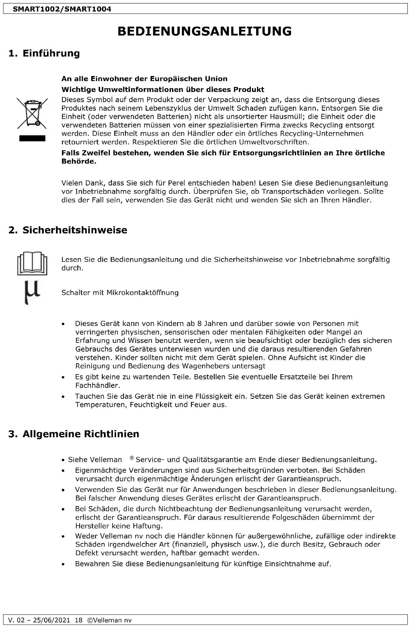 © URHEBERRECHT Velleman NV besitzt das Urheberrecht für diese Bedienungsanleitung. Alle weltweiten Rechte vorbehalten. Ohne vorherige schriftliche Genehmigung des Urhebers ist es nicht gestattet, diese Bedienungsanleitung ganz oder in Teilen zu reproduzieren, zu kopieren, zu übersetzen, zu bearbeiten oder zu speichern.SMART1002/SMART1004
