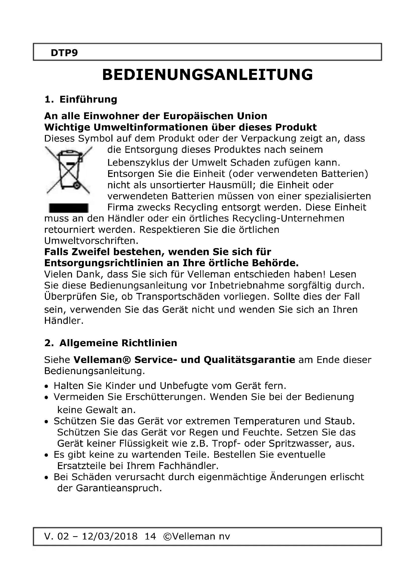 Siehe Velleman® Service- und Qualitätsgarantie am Ende dieser Bedienungsanleitung. Halten Sie Kinder und Unbefugte vom Gerät fern. Vermeiden Sie Erschütterungen. Wenden Sie bei der Bedienung keine Gewalt an. Schützen Sie das Gerät vor extremen Temperaturen und Staub. Schützen Sie das Gerät vor Regen und Feuchte. Setzen Sie das Gerät keiner Flüssigkeit wie z.B. Tropf- oder Spritzwasser, aus. Es gibt keine zu wartenden Teile. Bestellen Sie eventuelle Ersatzteile bei Ihrem Fachhändler. Bei Schäden verursacht durch eigenmächtige Änderungen erlischt der Garantieanspruch.DTP9