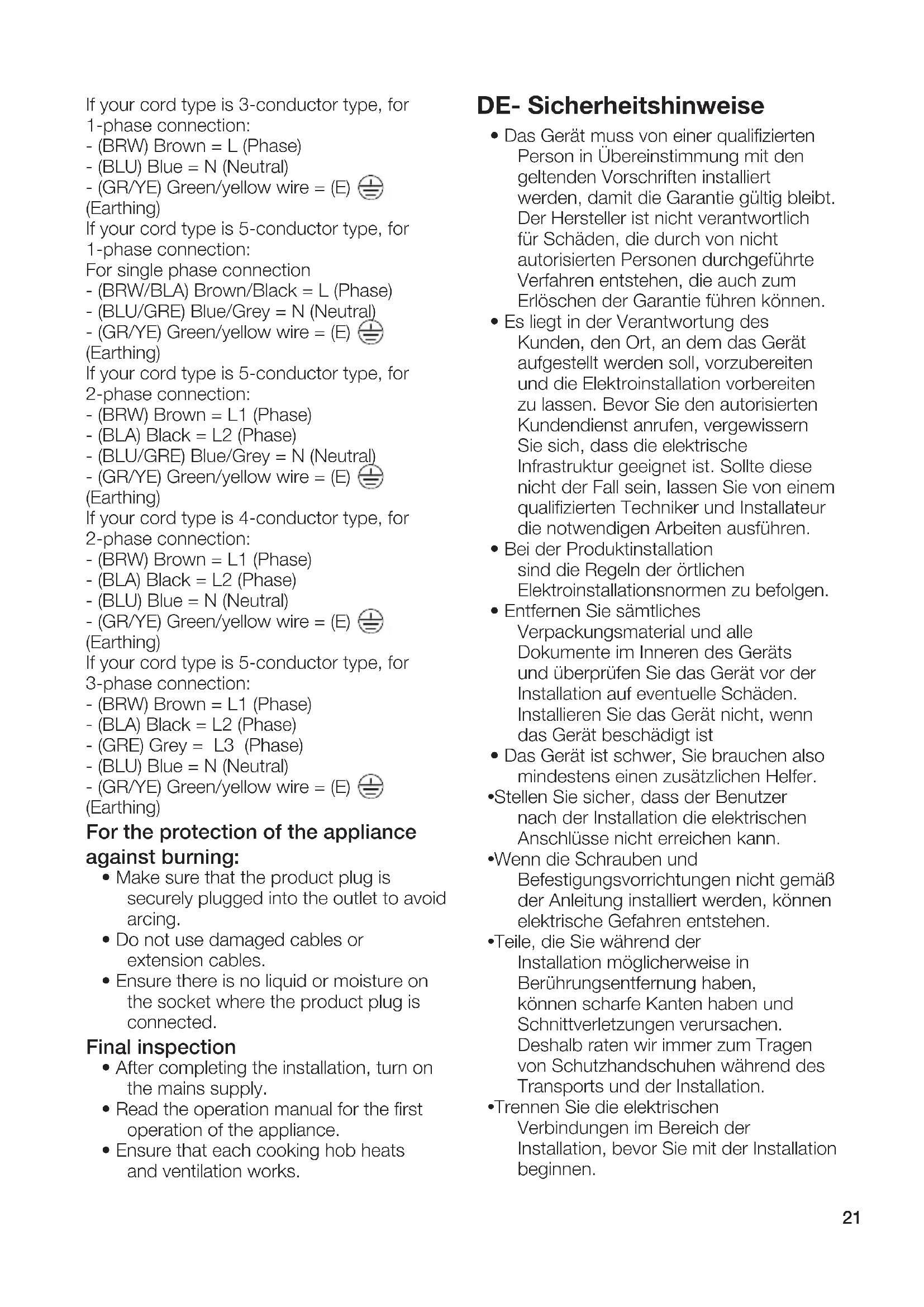 - Schließen Sie Ihr Gerät entsprechend dem Kabeltyp wie unten angegeben an das Stromnetz an. Der Kabeltyp Ihres Geräts ist im Abschnitt „Technische Daten“ des Bedienungshandbuchs angegeben. Wenn Ihr Kabeltyp 3-Leitertyp ist, für 1-phasigen Anschluss: - (BRW) Braun = L (Phase) - (BLU) Blau = N (Neutral) - (GR/YE) Grüner/gelber Draht = (E) (Earthing) Wenn Ihr Kabeltyp 5-Leitertyp ist, für 1-phasigen Anschluss: Für einphasigen Anschluss - (BRW/BLA) Braun/Schwarz = L (Phase) - (BLU/GRAU) Blau/Grau = N (Neutral) - (GR/YE) Grüner/gelber Draht = (E) (Earthing) Wenn Ihr Kabeltyp 5-Leitertyp ist, für 2-phasigen Anschluss: - (BRW) Braun = L1 (Phase) - (BLA) Schwarz = L2 (Phase) - (BLU/GRAU) Blau/Grau = N (Neutral) - (GR/YE) Grüner/gelber Draht = (E) (Earthing) Wenn Ihr Kabeltyp 4-Leitertyp ist, für 2-phasigen Anschluss: - (BRW) Braun = L1 (Phase) - (BLA) Schwarz = L2 (Phase) - (BLU) Blau = N (Neutral) - (GR/YE) Grüner/gelber Draht = (E) (Earthing) Wenn Ihr Kabeltyp 5-Leitertyp ist, für 3-phasigen Anschluss: - (BRW) Braun = L1 (Phase) - (BLA) Schwarz = L2 (Phase) - (GRE) Grau = L3 (Phase) - (BLU) Blau = N (Neutral) - (GR/YE) Grüner/gelber Draht = (E) (Earthing)26 Zum Schutz des Gerätes vor Verbrennungen: