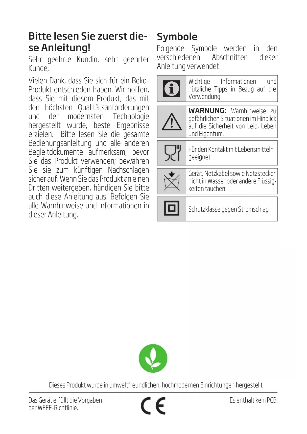 - Dropping the appliance will render it non-operational or cause permanent damage. Please see the cover page of the user manual for initial use, general use and cleaning sections.BittelesenSiezuerstdie- seAnleitung! Sehr geehrte Kundn, sehr geehrter Kunde, Velen Dank, dass Se sch für en Beko- Produkt entscheden haben. Wr hoffen, dass Se mt desem Produkt, das mt den höchsten Qualtätsanforderungen und der modernsten Technologe hergestellt wurde, beste Ergebnsse erzelen. Btte lesen Se de gesamte Bedenungsanletung und alle anderen Begletdokumente aufmerksam, bevor Se das Produkt verwenden; bewahren Se se zum künftgen Nachschlagen scher auf. Wenn Se das Produkt an enen Drtten wetergeben, händgen Se btte auch dese Anletung aus. Befolgen Se alle Warnhnwese und Informatonen n deser Anletung. Deses Produkt wurde n umweltfreundlchen, hochmodernen Enrchtungen hergestellt Das Gerät erfüllt de Vorgaben der WEEE-Rchtlne. Es enthält ken PCB. Symbole Folgende Symbole werden n den verschedenen Abschntten deser Anletung verwendet: