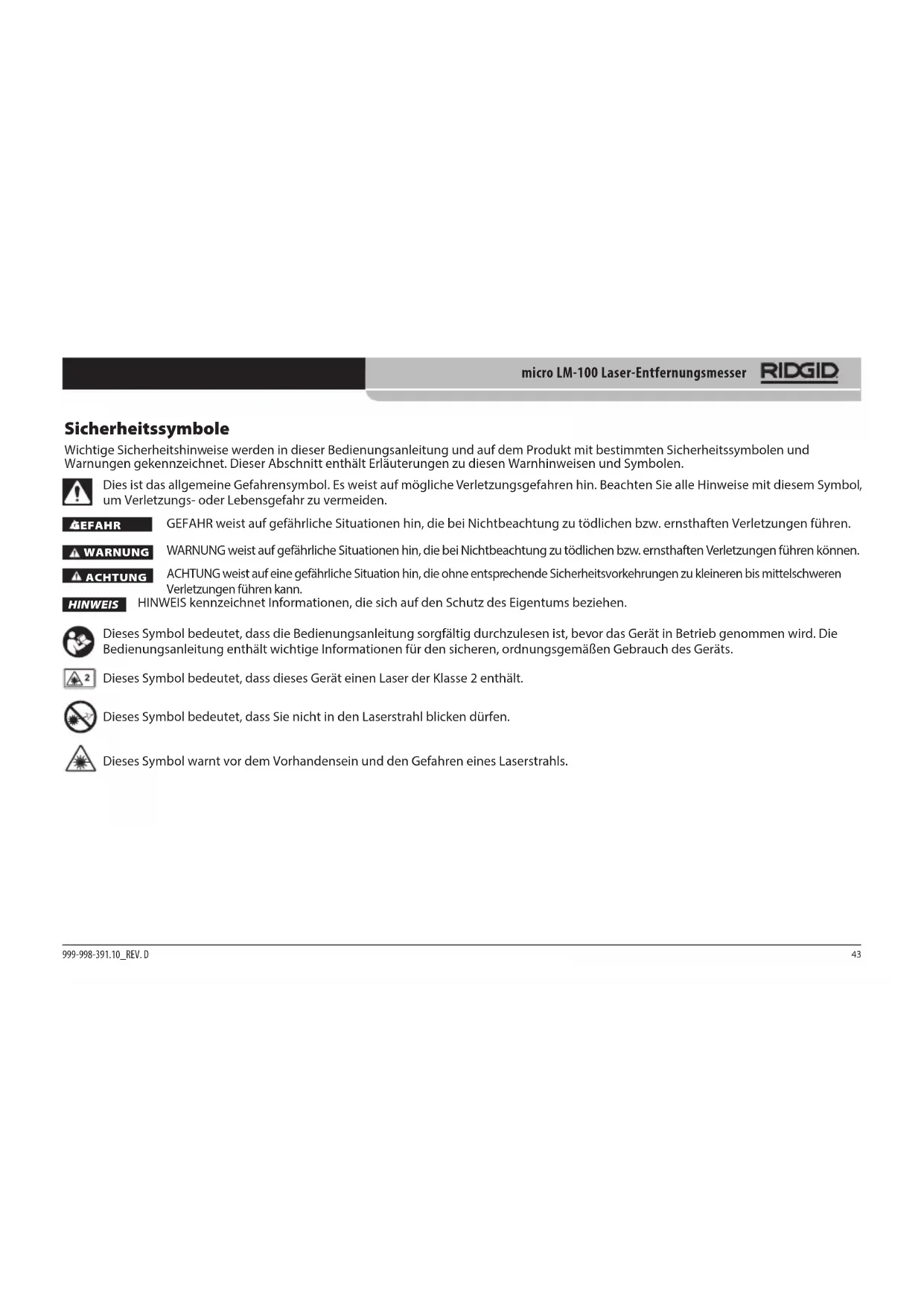 Sicherheitssymbole Wichtige Sicherheitshinweise werden in dieser Bedienungsanleitung und auf dem Produkt mit bestimmten Sicherheitssymbolen und Warnungen gekennzeichnet. Dieser Abschnitt enthält Erläuterungen zu diesen Warnhinweisen und Symbolen. GEFAHR Dies ist das allgemeine Gefahrensymbol. Es weist auf mögliche Verletzungsgefahren hin. Beachten Sie alle Hinweise mit diesem Symbol, um Verletzungs- oder Lebensgefahr zu vermeiden. GEFAHR weist auf gefährliche Situationen hin, die bei Nichtbeachtung zu tödlichen bzw. ernsthaften Verletzungen führen. WARNUNG weist auf gefährliche Situationen hin, die bei Nichtbeachtung zu tödlichen bzw. ernsthaften Verletzungen führen können. ACHTUNG weist auf eine gefährliche Situation hin, die ohne entsprechende Sicherheitsvorkehrungen zu kleineren bis mittelschweren Verletzungen führen kann. HINWEIS kennzeichnet Informationen, die sich auf den Schutz des Eigentums beziehen. Dieses Symbol bedeutet, dass die Bedienungsanleitung sorgfältig durchzulesen ist, bevor das Gerät in Betrieb genommen wird. Die Bedienungsanleitung enthält wichtige Informationen für den sicheren, ordnungsgemäßen Gebrauch des Geräts. HINWEIS WARNUNG Dieses Symbol bedeutet, dass dieses Gerät einen Laser der Klasse 2 enthält. Dieses Symbol bedeutet, dass Sie nicht in den Laserstrahl blicken dürfen. Dieses Symbol warnt vor dem Vorhandensein und den Gefahren eines Laserstrahls. ACHTUNG44 micro LM-100 Laser-Entfernungsmesser