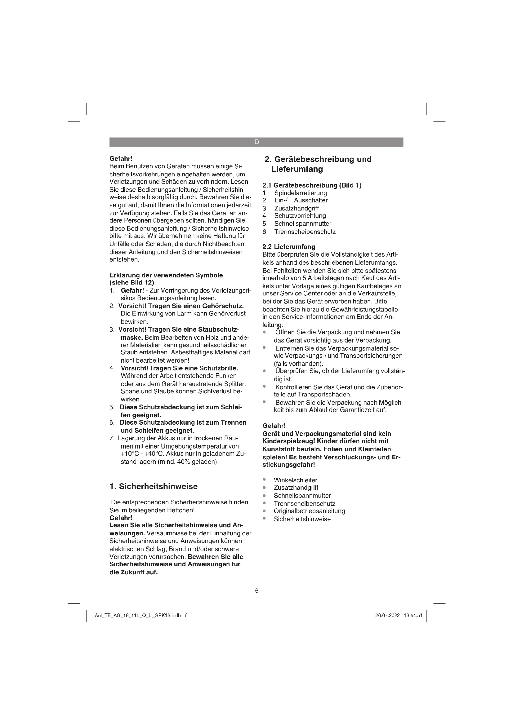 Achten Sie bei der Benutzung von Diamant- Trennscheiben auf die Drehrichtung. Der Drehrichtungspfeil auf der Diamant-Trenn- scheibe muss mit dem Drehrichtungspfeil auf dem Gerät übereinstimmen. Warnung! Achten Sie insbesondere bei den Schleifkörpern auf eine gute Lagerung und Transport. Setzen Sie die Schleifkörper niemals Stößen, Schlägen oder scharfen Kanten aus (z.B. beim Transport oder Lagerung in einer Werkzeugkiste). Dies könnte bei den Schleifkörpern zu Beschädigungen, wie z. B. Rissen führen und eine Gefahr für den Be- nutzer darstellen. Anl_TE_AG_18_115_Q_Li_SPK13.indb 9Anl_TE_AG_18_115_Q_Li_SPK13.indb 9 26.07.2022 13:54:5326.07.2022 13:54:53D
