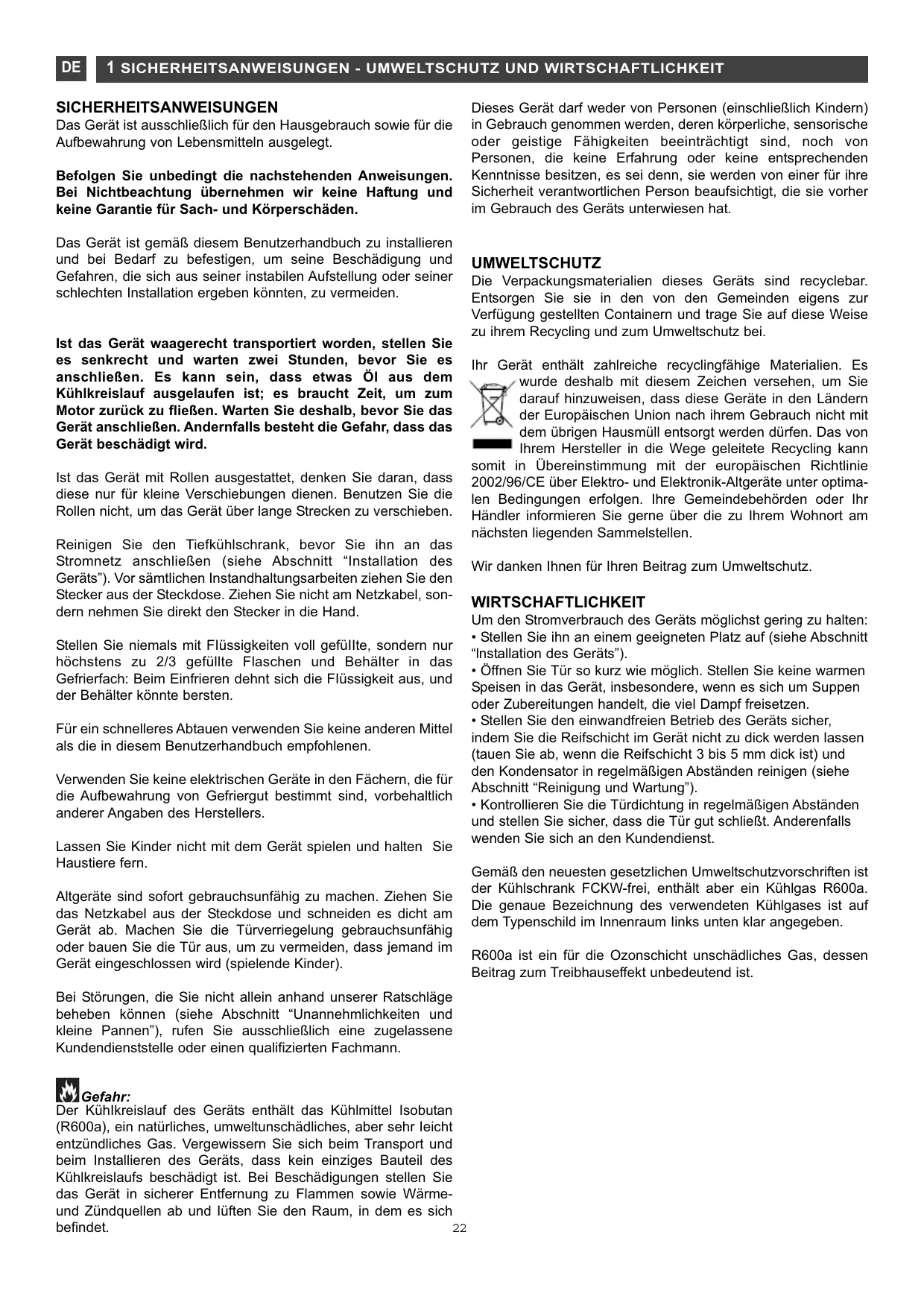 SICHERHEITSANWEISUNGEN Das Gerät ist ausschließlich für den Hausgebrauch sowie für die Aufbewahrung von Lebensmitteln ausgelegt. Befolgen Sie unbedingt die nachstehenden Anweisungen. Bei Nichtbeachtung übernehmen wir keine Haftung und keine Garantie für Sach- und Körperschäden. Das Gerät ist gemäß diesem Benutzerhandbuch zu installieren und bei Bedarf zu befestigen, um seine Beschädigung und Gefahren, die sich aus seiner instabilen Aufstellung oder seiner schlechten Installation ergeben könnten, zu vermeiden. Ist das Gerät waagerecht transportiert worden, stellen Sie es senkrecht und warten zwei Stunden, bevor Sie es anschließen. Es kann sein, dass etwas Öl aus dem Kühlkreislauf ausgelaufen ist; es braucht Zeit, um zum Motor zurück zu fließen. Warten Sie deshalb, bevor Sie das Gerät anschließen. Andernfalls besteht die Gefahr, dass das Gerät beschädigt wird. Ist das Gerät mit Rollen ausgestattet, denken Sie daran, dass diese nur für kleine Verschiebungen dienen. Benutzen Sie die Rollen nicht, um das Gerät über lange Strecken zu verschieben. Reinigen Sie den Tiefkühlschrank, bevor Sie ihn an das Stromnetz anschließen (siehe Abschnitt “Installation des Geräts”). Vor sämtlichen Instandhaltungsarbeiten ziehen Sie den Stecker aus der Steckdose. Ziehen Sie nicht am Netzkabel, sondern nehmen Sie direkt den Stecker in die Hand. Stellen Sie niemals mit FIüssigkeiten voll gefüIIte, sondern nur höchstens zu 2/3 gefüllte Flaschen und Behälter in das Gefrierfach: Beim Einfrieren dehnt sich die FIüssigkeit aus, und der Behälter könnte bersten. Für ein schnelleres Abtauen verwenden Sie keine anderen Mittel als die in diesem Benutzerhandbuch empfohlenen. Verwenden Sie keine elektrischen Geräte in den Fächern, die für die Aufbewahrung von Gefriergut bestimmt sind, vorbehaltlich anderer Angaben des Herstellers. Lassen Sie Kinder nicht mit dem Gerät spielen und halten Sie Haustiere fern. Altgeräte sind sofort gebrauchsunfähig zu machen. Ziehen Sie das Netzkabel aus der Steckdose und schneiden es dicht am Gerät ab. Machen Sie die Türverriegelung gebrauchsunfähig oder bauen Sie die Tür aus, um zu vermeiden, dass jemand im Gerät eingeschlossen wird (spielende Kinder). Bei Störungen, die Sie nicht allein anhand unserer Ratschläge beheben können (siehe Abschnitt “Unannehmlichkeiten und kleine Pannen”), rufen Sie ausschließlich eine zugelassene Kundendienststelle oder einen qualifizierten Fachmann. Gefahr: Der KühIkreislauf des Geräts enthält das Kühlmittel Isobutan (R600a), ein natürliches, umweltunschädliches, aber sehr Ieicht entzündliches Gas. Vergewissern Sie sich beim Transport und beim Installieren des Geräts, dass kein einziges Bauteil des Kühlkreislaufs beschädigt ist. Bei Beschädigungen stellen Sie das Gerät in sicherer Entfernung zu Flammen sowie Wärmeund Zündquellen ab und Iüften Sie den Raum, in dem es sich befindet. Dieses Gerät darf weder von Personen (einschließlich Kindern) in Gebrauch genommen werden, deren körperliche, sensorische oder geistige Fähigkeiten beeinträchtigt sind, noch von Personen, die keine Erfahrung oder keine entsprechenden Kenntnisse besitzen, es sei denn, sie werden von einer für ihre Sicherheit verantwortlichen Person beaufsichtigt, die sie vorher im Gebrauch des Geräts unterwiesen hat. UMWELTSCHUTZ Die Verpackungsmaterialien dieses Geräts sind recyclebar. Entsorgen Sie sie in den von den Gemeinden eigens zur Verfügung gestellten Containern und trage Sie auf diese Weise zu ihrem Recycling und zum Umweltschutz bei. Ihr Gerät enthält zahlreiche recyclingfähige Materialien. Es wurde deshalb mit diesem Zeichen versehen, um Sie darauf hinzuweisen, dass diese Geräte in den Ländern der Europäischen Union nach ihrem Gebrauch nicht mit dem übrigen Hausmüll entsorgt werden dürfen. Das von Ihrem Hersteller in die Wege geleitete Recycling kann somit in Übereinstimmung mit der europäischen Richtlinie 2002/96/CE über Elektro- und Elektronik-Altgeräte unter optimalen Bedingungen erfolgen. Ihre Gemeindebehörden oder Ihr Händler informieren Sie gerne über die zu Ihrem Wohnort am nächsten liegenden Sammelstellen. Wir danken Ihnen für Ihren Beitrag zum Umweltschutz. WIRTSCHAFTLICHKEIT Um den Stromverbrauch des Geräts möglichst gering zu halten: