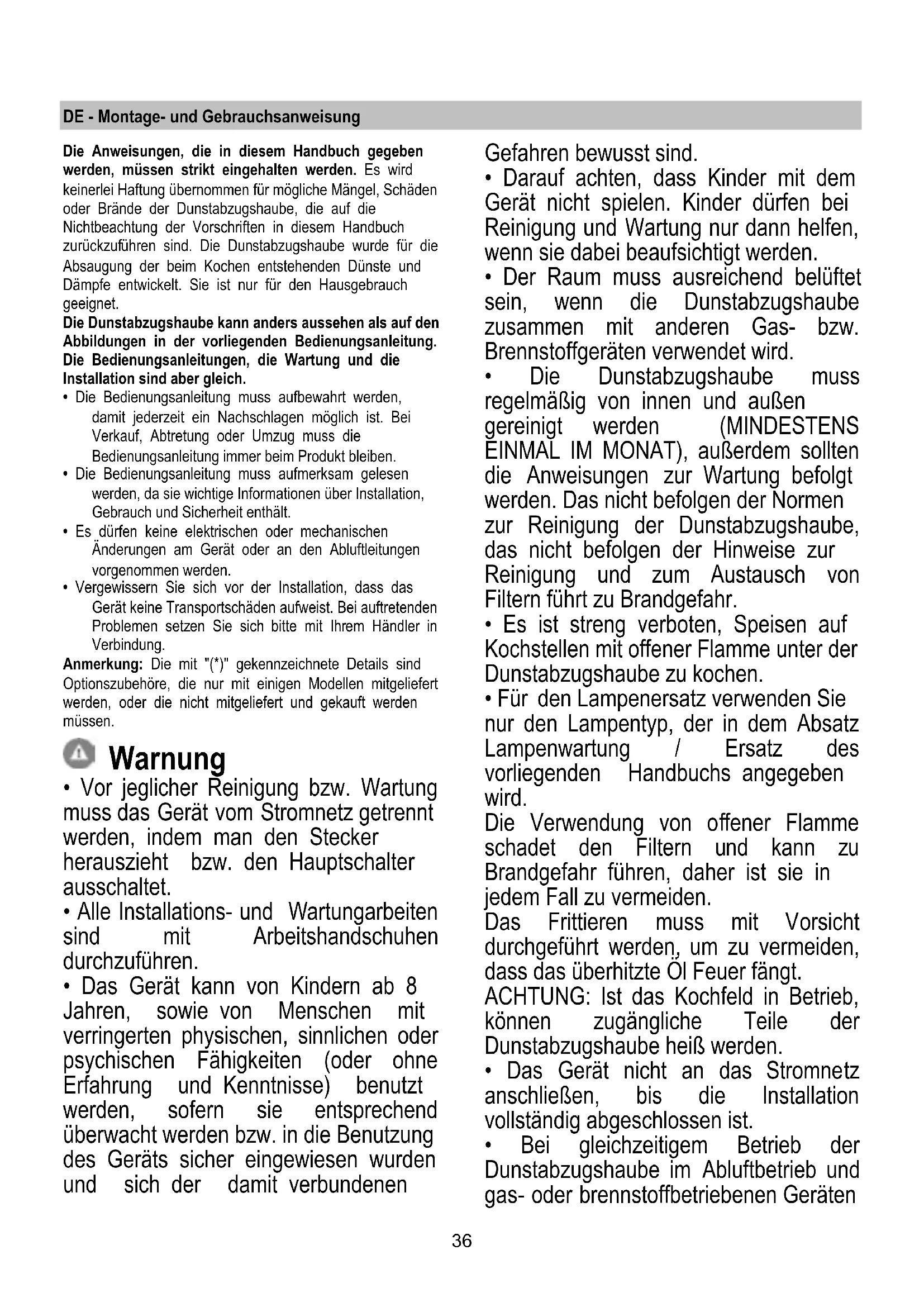 - Der Raum muss ausreichend belüftet sein, wenn die Dunstabzugshaube zusammen mit anderen Gas- bzw. Brennstoffgeräten verwendet wird.