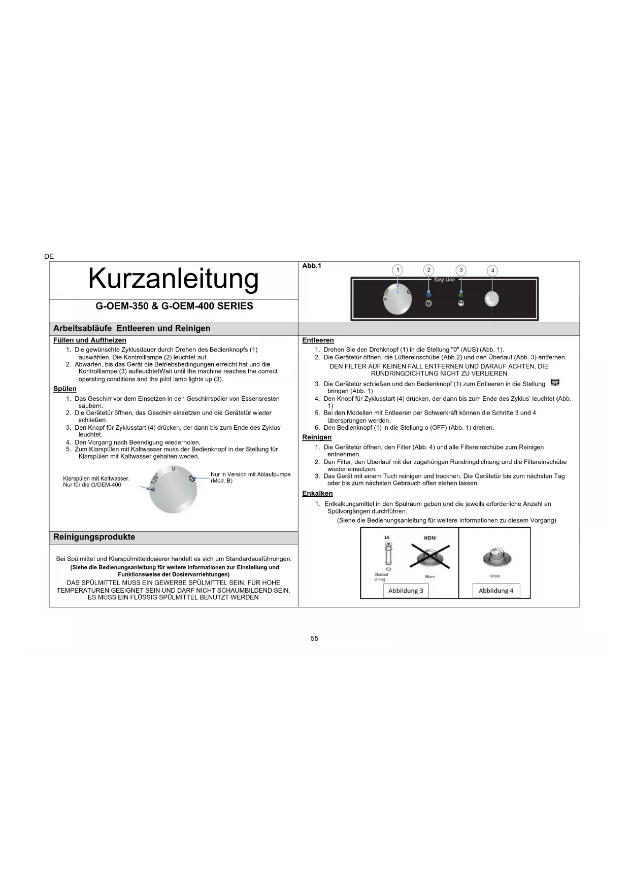Arbeitsabläufe Entleeren und Reinigen Füllen und Auftheizen 1. Die Gerätetur Schließen und den knopf (1) drücken. Die LED in der Taste (1) leuchtet auf. 2. Abwarten, bis das Gerät die Betriebsbedingungen erreicht hat und die Kontrolllampe (5) aufleuchtetWait. Spülen 1. Das Geschirr vor dem Einsetzen in den Geschirrspüler von Essensresten säubern. 2. Die Gerätetür öffnen, das Geschirr einsetzen und die Gerätetür wieder schließen. 3. Den gewünschten Zyklus durch Drücken des Knopfs (2), (3) oder (4) auswählen. Die LEDs innerhalb der Zyklus Start Taste zeigen an, dass die Maschine läuft. 4. Den Vorgang nach Beendigung wiederholen. 5. In G / M-400-Modellen ohne SOFT, Taste (4) hat Doppelfunktion. Halten Sie es gedrückt, um kalt zu spülen. Entleeren 1. Während die Maschine eingeschaltet ist, öffnen Sie die TürDen. 2. Die Überlauf (Abb. 3) entfernen. DEN FILTER AUF KEINEN FALL ENTFERNEN UND DARAUF ACHTEN, DIE RUNDRINGDICHTUNG NICHT ZU VERLIEREN 3. Schließen Sie die Tür, drücken Sie den Knopf (2) 3 Sekunden lang, um den Ablauf zu starten. Das LED-Licht in der Taste (2) beginnt zu blinken 4. Abwarten, bis die Kontrolllampe (2) erlischt (Abb. 1) 5. Bei den Modellen mit Entleeren per Schwerkraft können die Schritte 3 und 4 übersprungen werden. 6. Taste (1) drücken, um das Gerät auszuschalten und die Tür zu schließen. Regenerierungszyklus 1. Der Regenerationszyklus in SOFT-Modellen muss nach dem Entleeren erfolgen. Die Maschine muss leer sein. 2. Wenn die LED-Anzeige (2) leuchtet, füllen Sie den Salzbehälter in die Maschine. 3. Öffnen Sie die Tür. 4. Drücken Sie die Taste (3) während 3 Sekunden. 5. Sobald das LED-Licht in der Taste (3) zu blinken beginnt, schließen Sie die Tür. 6. Warten Sie, bis die Taste (3) nicht mehr leuchtet. 7. Reinigen Sie den inneren Teil der Maschine Reinigen 1. Die Gerätetür öffnen, den Filter (Abb. 4) und alle Filtereinschübe zum Reinigen entnehmen. 2. Den Filter, den Überlauf mit der zugehörigen Rundringdichtung und die Filtereinschübe wieder einsetzen. 3. Das Gerät mit einem Tuch reinigen und trocknen. Die Gerätetür bis zum nächsten Tag oder bis zum nächsten Gebrauch offen stehen lassen. Enkalken 1. Entkalkungsmittel in den Spülraum geben und die jeweils erforderliche Anzahl an Spülvorgängen durchführen. (Siehe die Bedienungsanleitung für weitere Informationen zu diesem Vorgang) Reinigungsprodukte Bei Spülmittel und Klarspülmitteldosierer handelt es sich um Standardausführungen. (Siehe die Bedienungsanleitung für weitere Informationen zur Einstellung und Funktionsweise der Dosiervorriehtungen) DAS SPÜLMITTEL MUSS EIN GEWERBE SPÜLMITTEL SEIN, FÜR HOHE TEMPERATUREN GEEIGNET SEIN UND DARF NICHT SCHAUMBILDEND SEIN. ES MUSS EIN FLÜSSIG SPÜLMITTEL BENUTZT WERDEN 4DE
