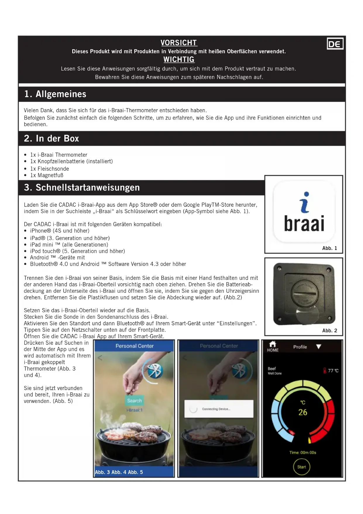 - Bluetooth® 4.0 und Android ™ Software Version 4.3 oder höher Trennen Sie den i-Braai von seiner Basis, indem Sie die Basis mit einer Hand festhalten und mit der anderen Hand das i-Braai-Oberteil vorsichtig nach oben ziehen. Drehen Sie die Batterieab- deckung an der Unterseite des i-Braai und öffnen Sie sie, indem Sie sie gegen den Uhrzeigersinn drehen. Entfernen Sie die Plastikusen und setzen Sie die Abdeckung wieder auf. (Abb.2) Setzen Sie das i-Braai-Oberteil wieder auf die Basis. Stecken Sie die Sonde in den Sondenanschluss des i-Braai. Aktivieren Sie den Standort und dann Bluetooth® auf Ihrem Smart-Gerät unter “Einstellungen”. Tippen Sie auf den Netzschalter unten auf der Frontplatte. Öffnen Sie die CADAC i-Braai App auf Ihrem Smart-Gerät. Drücken Sie auf Suchen in der Mitte der App und es wird automatisch mit Ihrem i-Braai gekoppelt Thermometer (Abb. 3 und 4). Sie sind jetzt verbunden und bereit, Ihren i-Braai zu verwenden. (Abb. 5) Abb. 2 Abb. 3 Abb. 4 Abb. 5