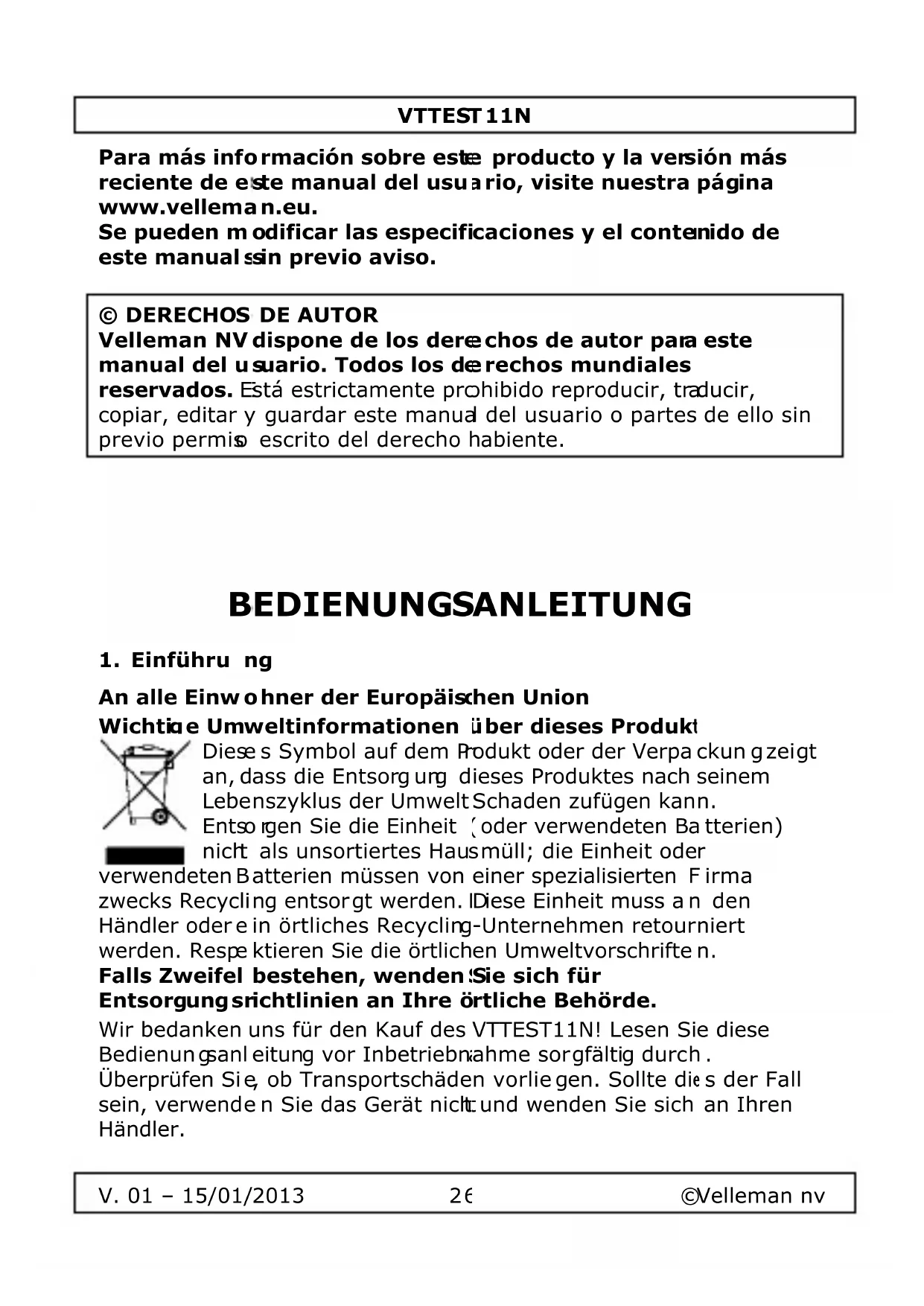 BEDIENUNGSANLEITUNG VTTEST11N VELLEMAN
