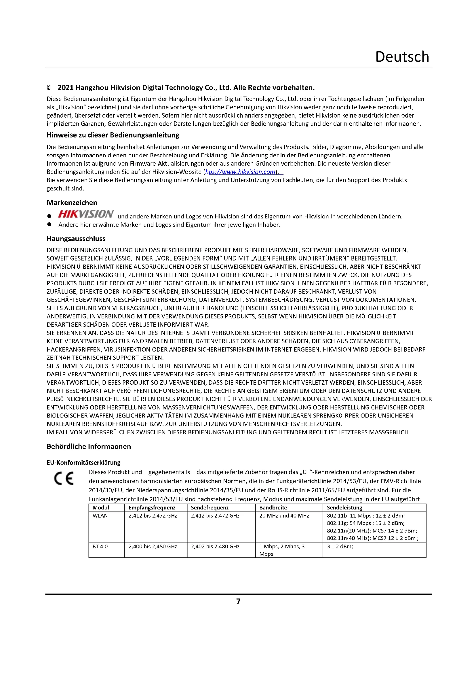 © 2021 Hangzhou Hikvision Digital Technology Co., Ltd. Alle Rechte vorbehalten. Diese Bedienungsanleitung ist Eigentum der Hangzhou Hikvision Digital Technology Co., Ltd. oder ihrer Tochtergesellschaften (im Folgenden als „Hikvision“ bezeichnet) und sie darf ohne vorherige schriftliche Genehmigung von Hikvision weder ganz noch teilweise reproduziert, geändert, übersetzt oder verteilt werden. Sofern hier nicht ausdrücklich anders angegeben, bietet Hikvision keine ausdrücklichen oder implizierten Garantien, Gewährleistungen oder Darstellungen bezüglich der Bedienungsanleitung und der darin enthaltenen Informationen. Hinweise zu dieser Bedienungsanleitung Die Bedienungsanleitung beinhaltet Anleitungen zur Verwendung und Verwaltung des Produkts. Bilder, Diagramme, Abbildungen und alle sonstigen Informationen dienen nur der Beschreibung und Erklärung. Die Änderung der in der Bedienungsanleitung enthaltenen Informationen ist aufgrund von Firmware-Aktualisierungen oder aus anderen Gründen vorbehalten. Die neueste Version dieser Bedienungsanleitung finden Sie auf der Hikvision-Website (https://www.hikvision.com). Bitte verwenden Sie diese Bedienungsanleitung unter Anleitung und Unterstützung von Fachleuten, die für den Support des Produkts geschult sind. Markenzeichen und andere Marken und Logos von Hikvision sind das Eigentum von Hikvision in verschiedenen Ländern. Andere hier erwähnte Marken und Logos sind Eigentum ihrer jeweiligen Inhaber. Haftungsausschluss DIESE BEDIENUNGSANLEITUNG UND DAS BESCHRIEBENE PRODUKT MIT SEINER HARDWARE, SOFTWARE UND FIRMWARE WERDEN, SOWEIT GESETZLICH ZULÄSSIG, IN DER „VORLIEGENDEN FORM“ UND MIT „ALLEN FEHLERN UND IRRTÜMERN“ BEREITGESTELLT. HIKVISION Ü BERNIMMT KEINE AUSDRÜCKLICHEN ODER STILLSCHWEIGENDEN GARANTIEN, EINSCHLIESSLICH, ABER NICHT BESCHRÄNKT AUF DIE MARKTGÄNGIGKEIT, ZUFRIEDENSTELLENDE QUALITÄT ODER EIGNUNG FÜ R EINEN BESTIMMTEN ZWECK. DIE NUTZUNG DES PRODUKTS DURCH SIE ERFOLGT AUF IHRE EIGENE GEFAHR. IN KEINEM FALL IST HIKVISION IHNEN GEGENÜ BER HAFTBAR FÜ R BESONDERE, ZUFÄLLIGE, DIREKTE ODER INDIREKTE SCHÄDEN, EINSCHLIESSLICH, JEDOCH NICHT DARAUF BESCHRÄNKT, VERLUST VON GESCHÄFTSGEWINNEN, GESCHÄFTSUNTERBRECHUNG, DATENVERLUST, SYSTEMBESCHÄDIGUNG, VERLUST VON DOKUMENTATIONEN, SEI ES AUFGRUND VON VERTRAGSBRUCH, UNERLAUBTER HANDLUNG (EINSCHLIESSLICH FAHRLÄSSIGKEIT), PRODUKTHAFTUNG ODER ANDERWEITIG, IN VERBINDUNG MIT DER VERWENDUNG DIESES PRODUKTS, SELBST WENN HIKVISION ÜBER DIE MÖ GLICHKEIT DERARTIGER SCHÄDEN ODER VERLUSTE INFORMIERT WAR. SIE ERKENNEN AN, DASS DIE NATUR DES INTERNETS DAMIT VERBUNDENE SICHERHEITSRISIKEN BEINHALTET. HIKVISION Ü BERNIMMT KEINE VERANTWORTUNG FÜR ANORMALEN BETRIEB, DATENVERLUST ODER ANDERE SCHÄDEN, DIE SICH AUS CYBERANGRIFFEN, HACKERANGRIFFEN, VIRUSINFEKTION ODER ANDEREN SICHERHEITSRISIKEN IM INTERNET ERGEBEN. HIKVISION WIRD JEDOCH BEI BEDARF ZEITNAH TECHNISCHEN SUPPORT LEISTEN. SIE STIMMEN ZU, DIESES PRODUKT IN Ü BEREINSTIMMUNG MIT ALLEN GELTENDEN GESETZEN ZU VERWENDEN, UND SIE SIND ALLEIN DAFÜR VERANTWORTLICH, DASS IHRE VERWENDUNG GEGEN KEINE GELTENDEN GESETZE VERSTÖ ßT. INSBESONDERE SIND SIE DAFÜ R VERANTWORTLICH, DIESES PRODUKT SO ZU VERWENDEN, DASS DIE RECHTE DRITTER NICHT VERLETZT WERDEN, EINSCHLIESSLICH, ABER NICHT BESCHRÄNKT AUF VERÖ FFENTLICHUNGSRECHTE, DIE RECHTE AN GEISTIGEM EIGENTUM ODER DEN DATENSCHUTZ UND ANDERE PERSÖ NLICHKEITSRECHTE. SIE DÜRFEN DIESES PRODUKT NICHT FÜ R VERBOTENE ENDANWENDUNGEN VERWENDEN, EINSCHLIESSLICH DER ENTWICKLUNG ODER HERSTELLUNG VON MASSENVERNICHTUNGSWAFFEN, DER ENTWICKLUNG ODER HERSTELLUNG CHEMISCHER ODER BIOLOGISCHER WAFFEN, JEGLICHER AKTIVITÄTEN IM ZUSAMMENHANG MIT EINEM NUKLEAREN SPRENGKÖ RPER ODER UNSICHEREN NUKLEAREN BRENNSTOFFKREISLAUF BZW. ZUR UNTERSTÜTZUNG VON MENSCHENRECHTSVERLETZUNGEN. IM FALL VON WIDERSPRÜ CHEN ZWISCHEN DIESER BEDIENUNGSANLEITUNG UND GELTENDEM RECHT IST LETZTERES MASSGEBLICH. Behördliche Informationen EU-Konformitätserklärung