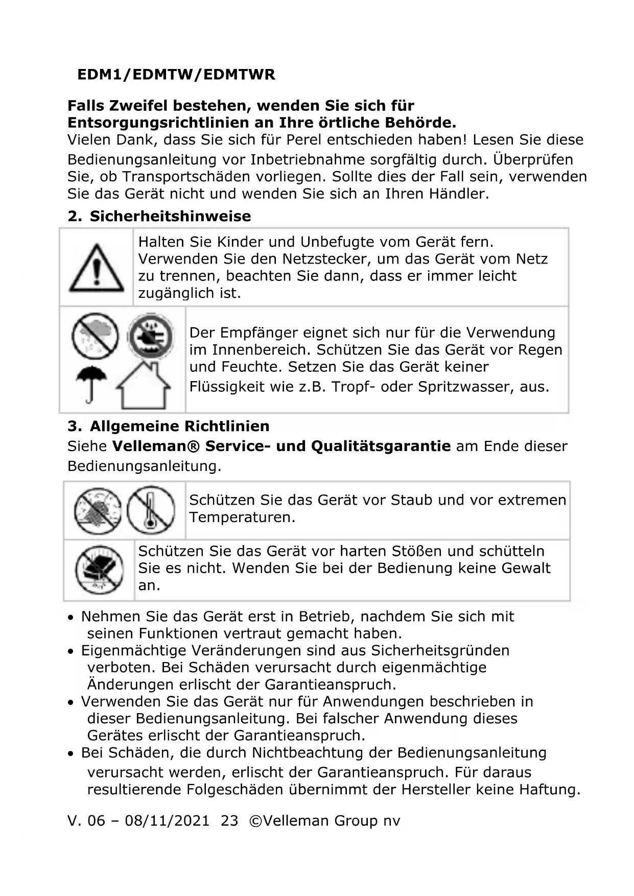 Frequenz .................................................. 433.95 MHz max. RF-Leistung .............................................. 10 mW kabellos .................................................................. ja Bereich ............................................. 150 m im Freifeld selbstlernend .......................................................... ja Druckknopf ........................................ mit LED-Anzeige Melodien ................................................................ 32 IP-Schutzart (Sender) .......................................... IP44 Stromversorgung Sender .............................. 1 x CR2032 (mitgeliefert) Empfänger ... 3 x 1.5 V AA-Batterie (nicht mitgeliefert) Verwenden Sie dieses Gerät nur mit originellen Zubehörteilen. Velleman Group nv übernimmt keine Haftung für Schaden oder Verletzungen bei (falscher) Anwendung dieses Gerätes. Für mehr Informationen zu diesem Produkt und die neueste Version dieser Bedienungsanleitung, siehe www.velleman.eu. Alle Änderungen ohne vorherige Ankündigung vorbehalten. © URHEBERRECHT Velleman Group nv besitzt das Urheberrecht für diese Bedienungsanleitung. Alle weltweiten Rechte vorbehalten. Ohne vorherige schriftliche Genehmigung des Urhebers ist es nicht gestattet, diese Bedienungsanleitung ganz oder in Teilen zu reproduzieren, zu kopieren, zu übersetzen, zu bearbeiten oder zu speichern.EDM1/EDMTW/EDMTWR