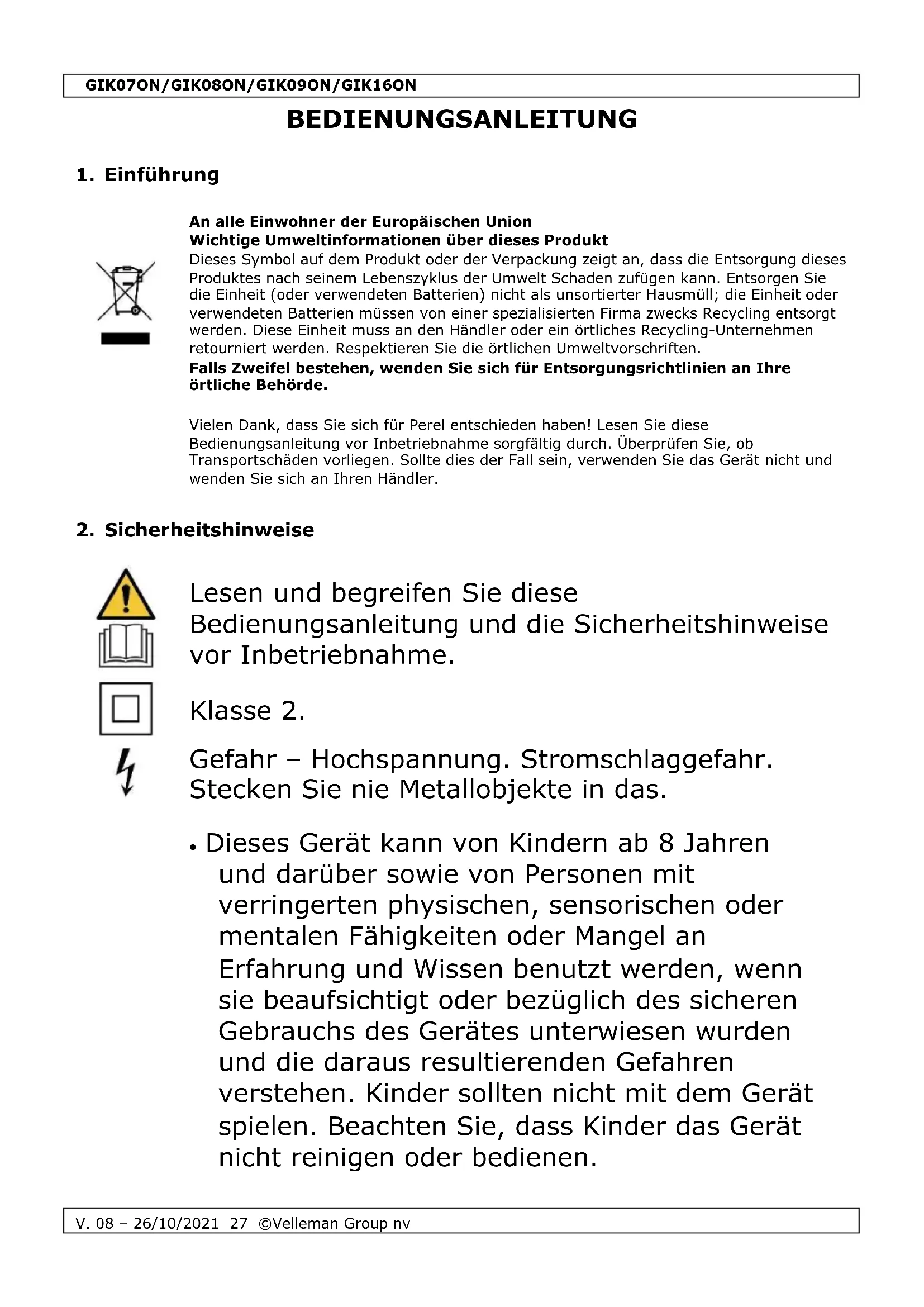 Velleman Group nv besitzt das Urheberrecht für diese Bedienungsanleitung. Alle weltweiten Rechte vorbehalten. Ohne vorherige schriftliche Genehmigung des Urhebers ist es nicht gestattet, diese Bedienungsanleitung ganz oder in Teilen zu reproduzieren, zu kopieren, zu übersetzen, zu bearbeiten oder zu speichern.GIK07ON/GIK08ON/GIK09ON/GIK16ON