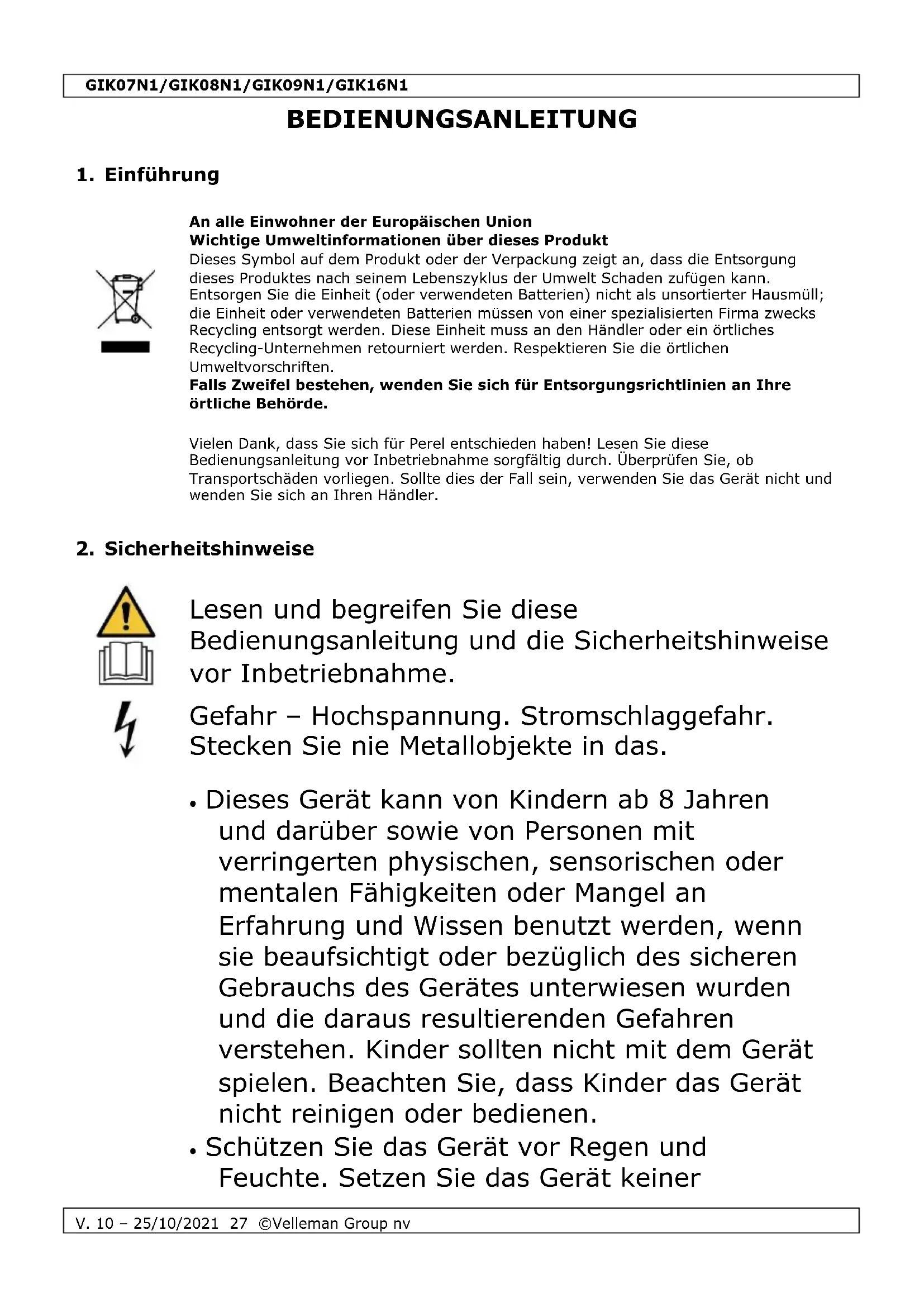 Velleman Group nv besitzt das Urheberrecht für diese Bedienungsanleitung. Alle weltweiten Rechte vorbehalten. Ohne vorherige schriftliche Genehmigung des Urhebers ist es nicht gestattet, diese Bedienungsanleitung ganz oder in Teilen zu reproduzieren, zu kopieren, zu übersetzen, zu bearbeiten oder zu speichern.GIK07N1/GIK08N1/GIK09N1/GIK16N1