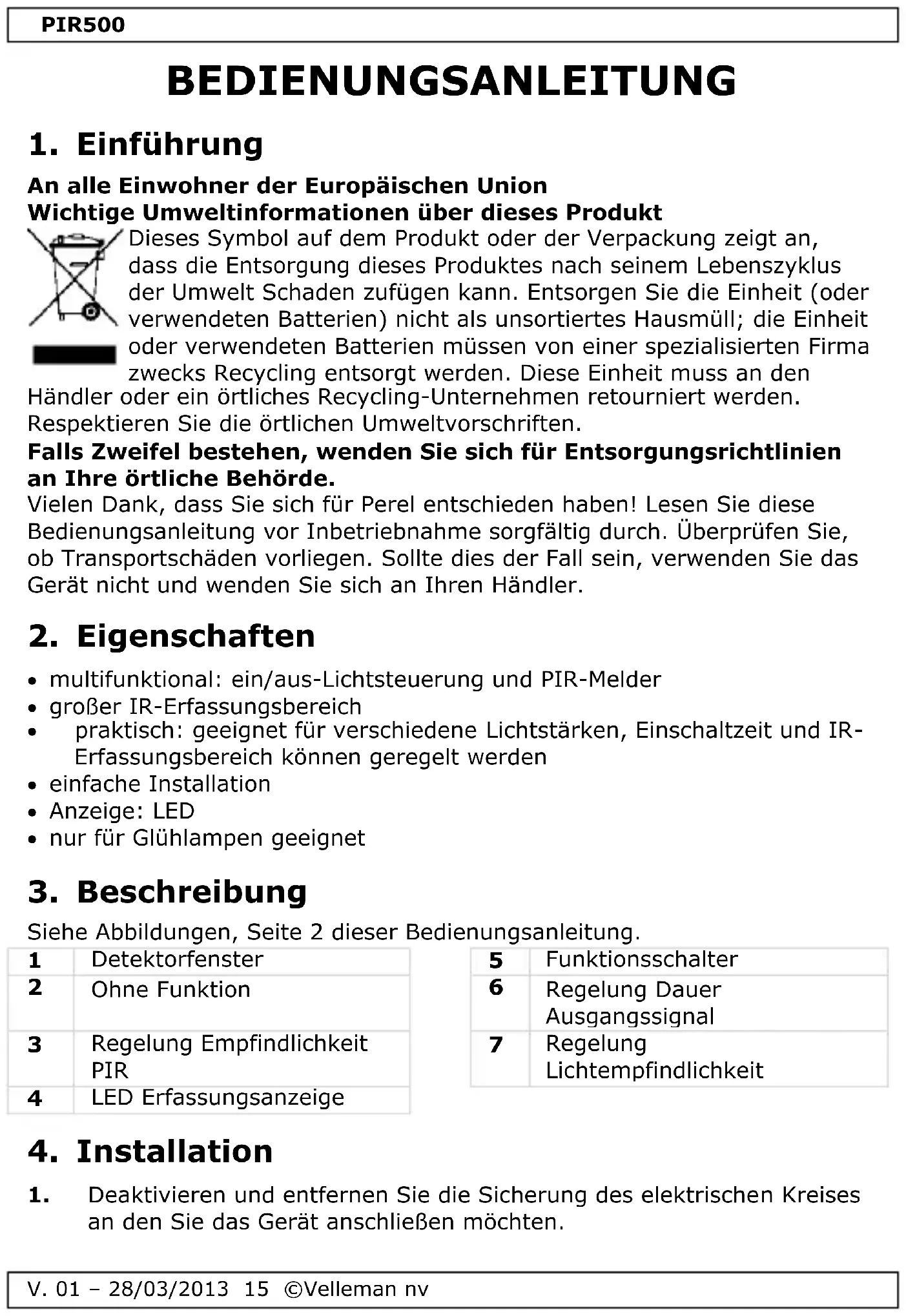 PIR500 - Detektor VELLEMAN - Kostenlose Bedienungsanleitung