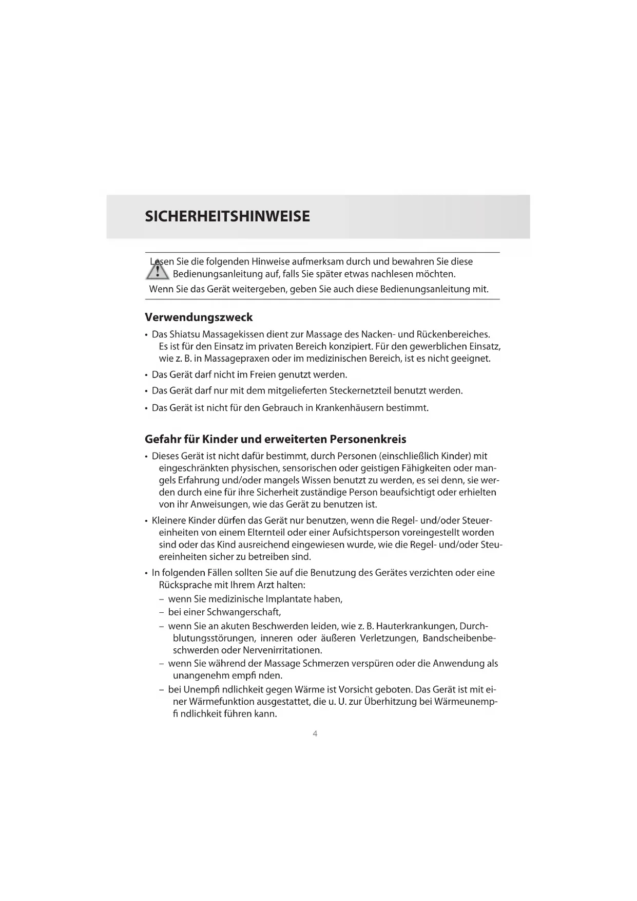 - In folgenden Fällen sollten Sie auf die Benutzung des Gerätes verzichten oder eine Rücksprache mit Ihrem Arzt halten: – wenn Sie medizinische Implantate haben, – bei einer Schwangerschaft, – wenn Sie an akuten Beschwerden leiden, wie z. B. Hauterkrankungen, Durch- blutungsstörungen, inneren oder äußeren Verletzungen, Bandscheibenbe- schwerden oder Nervenirritationen. – wenn Sie während der Massage Schmerzen verspüren oder die Anwendung als unangenehm emp nden. – bei Unemp ndlichkeit gegen Wärme ist Vorsicht geboten. Das Gerät ist mit ei- ner Wärmefunktion ausgestattet, die u. U. zur Überhitzung bei Wärmeunemp- ndlichkeit führen kann. SICHERHEITSHINWEISE5