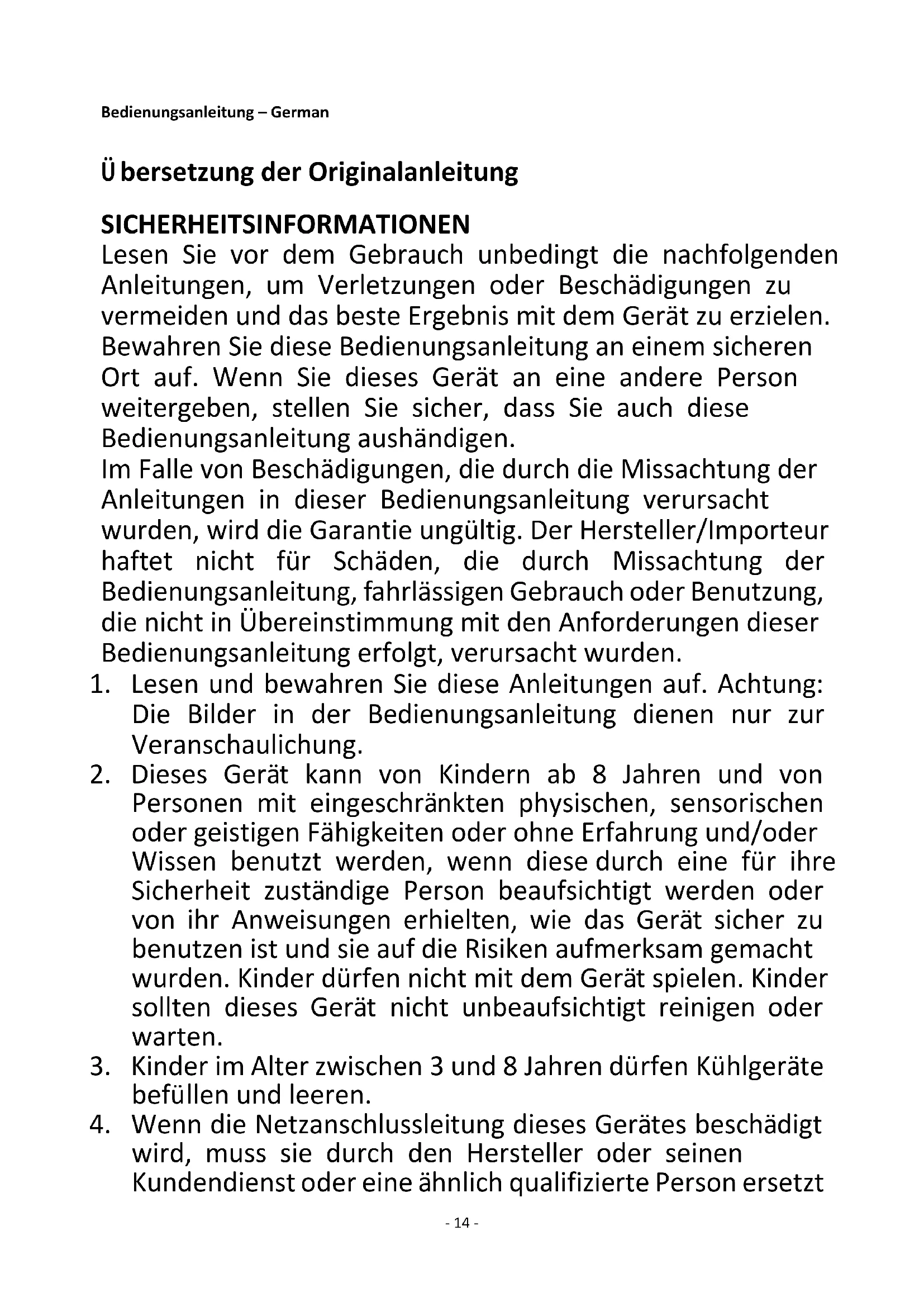 1. Lesen und bewahren Sie diese Anleitungen auf. Achtung: