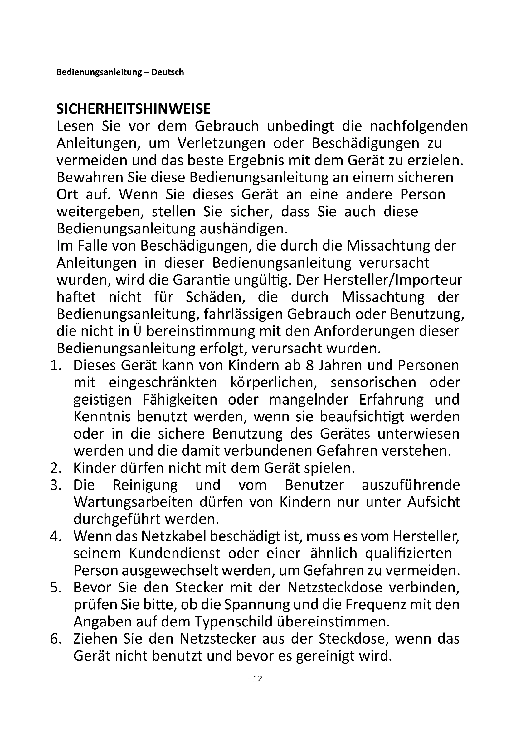 Recycling – European Directive 2012/19/EU This marking indicates that this product should not be disposed with other household wastes. To prevent possible harm to the environment or human health from uncontrolled waste disposal, recycle it responsibly to promote the sustainable reuse of material resources. To return your used device, please use the return and collection systems or contact the retailer where the product was purchased. They can take this product for environmentally safe recycling. BATTERY MUST BE RECYCLED OR DISPOSED OF PROPERLY. DO NOT OPEN. DO NOT DISPOSE OR IN FIRE OR SHORT CIRCUIT. EMERIO Switzerland AG Industriestrasse 47 6300 Zug Switzerland- 12 - Bedienungsanleitung – Deutsch SICHERHEITSHINWEISE Lesen Sie vor dem Gebrauch unbedingt die nachfolgenden Anleitungen, um Verletzungen oder Beschädigungen zu vermeiden und das beste Ergebnis mit dem Gerät zu erzielen. Bewahren Sie diese Bedienungsanleitung an einem sicheren Ort auf. Wenn Sie dieses Gerät an eine andere Person weitergeben, stellen Sie sicher, dass Sie auch diese Bedienungsanleitung aushändigen. Im Falle von Beschädigungen, die durch die Missachtung der Anleitungen in dieser Bedienungsanleitung verursacht wurden, wird die Garantie ungültig. Der Hersteller/Importeur haftet nicht für Schäden, die durch Missachtung der Bedienungsanleitung, fahrlässigen Gebrauch oder Benutzung, die nicht in Ü bereinstimmung mit den Anforderungen dieser Bedienungsanleitung erfolgt, verursacht wurden.