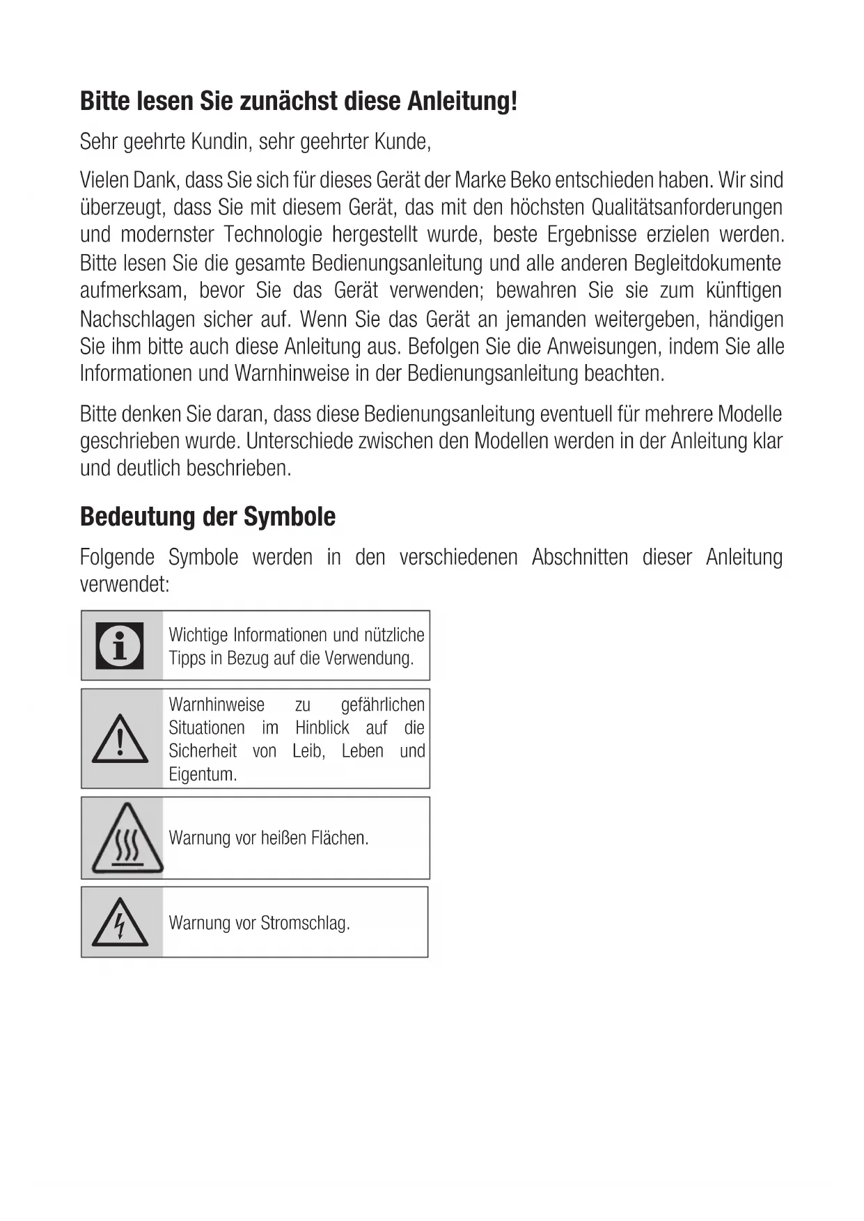 El garante e importador de su electrodoméstico es: BEKO SPAIN ELECTRONICS, S.L. Calle Provenza nº 388 3º Barcelona 08025, España. Conózcanos mejor en nuestra página: www.beko.com Conserve este documento, es importante para usted. (*) Se consideran electrodomésticos de gama blanca, los aparatos de gran tamaño de cocina, limpieza, refrigeración y ventilación y el pequeño aparato electrodoméstico (PAE) aquellos aparatos de higiene personal, mantenimiento del hogar y preparación de alimentos.Bitte lesen Sie zunächst diese Anleitung! Sehr geehrte Kundin, sehr geehrter Kunde, Vielen Dank, dass Sie sich für dieses Gerät der Marke Beko entschieden haben. Wir sind überzeugt, dass Sie mit diesem Gerät, das mit den höchsten Qualitätsanforderungen und modernster Technologie hergestellt wurde, beste Ergebnisse erzielen werden. Bitte lesen Sie die gesamte Bedienungsanleitung und alle anderen Begleitdokumente aufmerksam, bevor Sie das Gerät verwenden; bewahren Sie sie zum künftigen Nachschlagen sicher auf. Wenn Sie das Gerät an jemanden weitergeben, händigen Sie ihm bitte auch diese Anleitung aus. Befolgen Sie die Anweisungen, indem Sie alle Informationen und Warnhinweise in der Bedienungsanleitung beachten. Bitte denken Sie daran, dass diese Bedienungsanleitung eventuell für mehrere Modelle geschrieben wurde. Unterschiede zwischen den Modellen werden in der Anleitung klar und deutlich beschrieben. Bedeutung der Symbole Folgende Symbole werden in den verschiedenen Abschnitten dieser Anleitung verwendet: