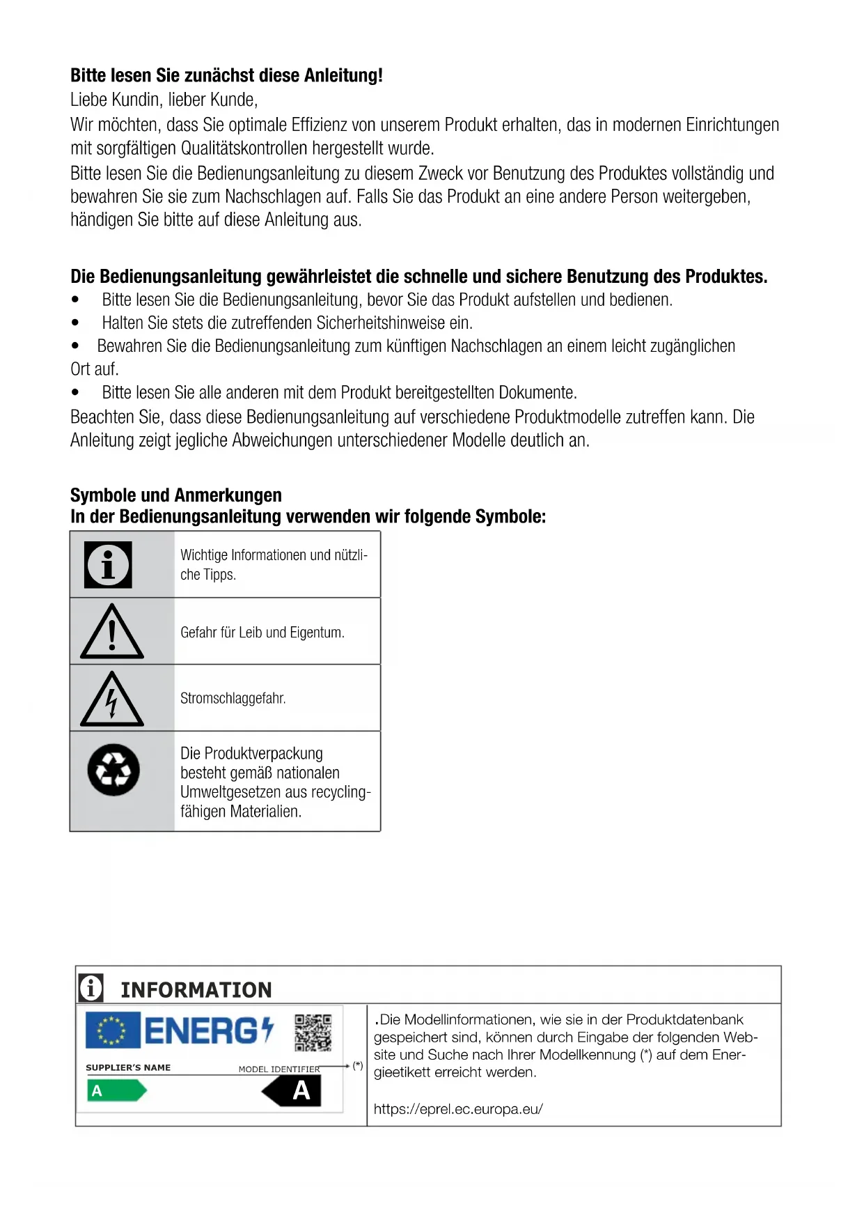 Bitte lesen Sie zunächst diese Anleitung! Liebe Kundin, lieber Kunde, Wir möchten, dass Sie optimale Effizienz von unserem Produkt erhalten, das in modernen Einrichtungen mit sorgfältigen Qualitätskontrollen hergestellt wurde. Bitte lesen Sie die Bedienungsanleitung zu diesem Zweck vor Benutzung des Produktes vollständig und bewahren Sie sie zum Nachschlagen auf. Falls Sie das Produkt an eine andere Person weitergeben, händigen Sie bitte auf diese Anleitung aus. Die Bedienungsanleitung gewährleistet die schnelle und sichere Benutzung des Produktes. t Bitte lesen Sie die Bedienungsanleitung, bevor Sie das Produkt aufstellen und bedienen.t Halten Sie stets die zutreffenden Sicherheitshinweise ein. t Bewahren Sie die Bedienungsanleitung zum künftigen Nachschlagen an einem leicht zugänglichen Ort auf. t Bitte lesen Sie alle anderen mit dem Produkt bereitgestellten Dokumente. Beachten Sie, dass diese Bedienungsanleitung auf verschiedene Produktmodelle zutreffen kann. Die Anleitung zeigt jegliche Abweichungen unterschiedener Modelle deutlich an. Symbole und Anmerkungen In der Bedienungsanleitung verwenden wir folgende Symbole: