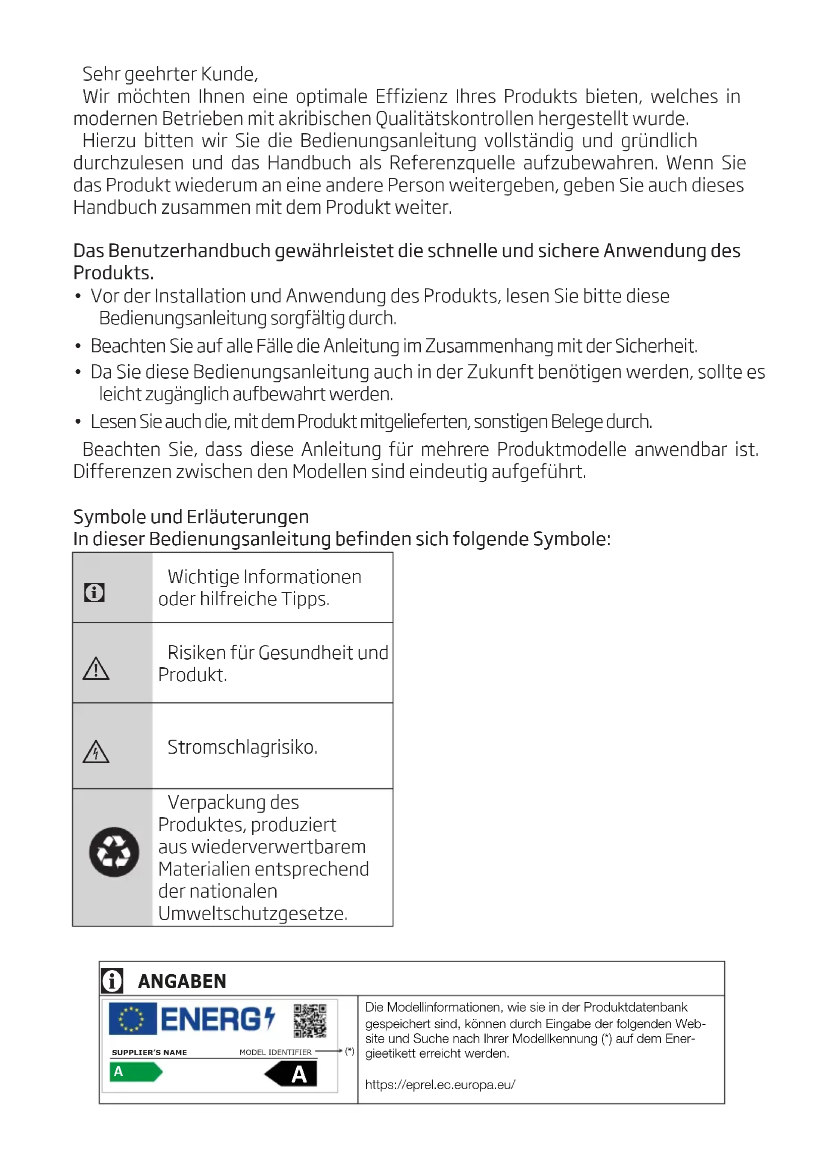 Die Modellinformationen, wie sie in der Produktdatenbank gespeichert sind, können durch Eingabe der folgenden Web-site und Suche nach Ihrer Modellkennung (*) auf dem Ener-gieetikett erreicht werden.https://eprel.ec.europa.eu/