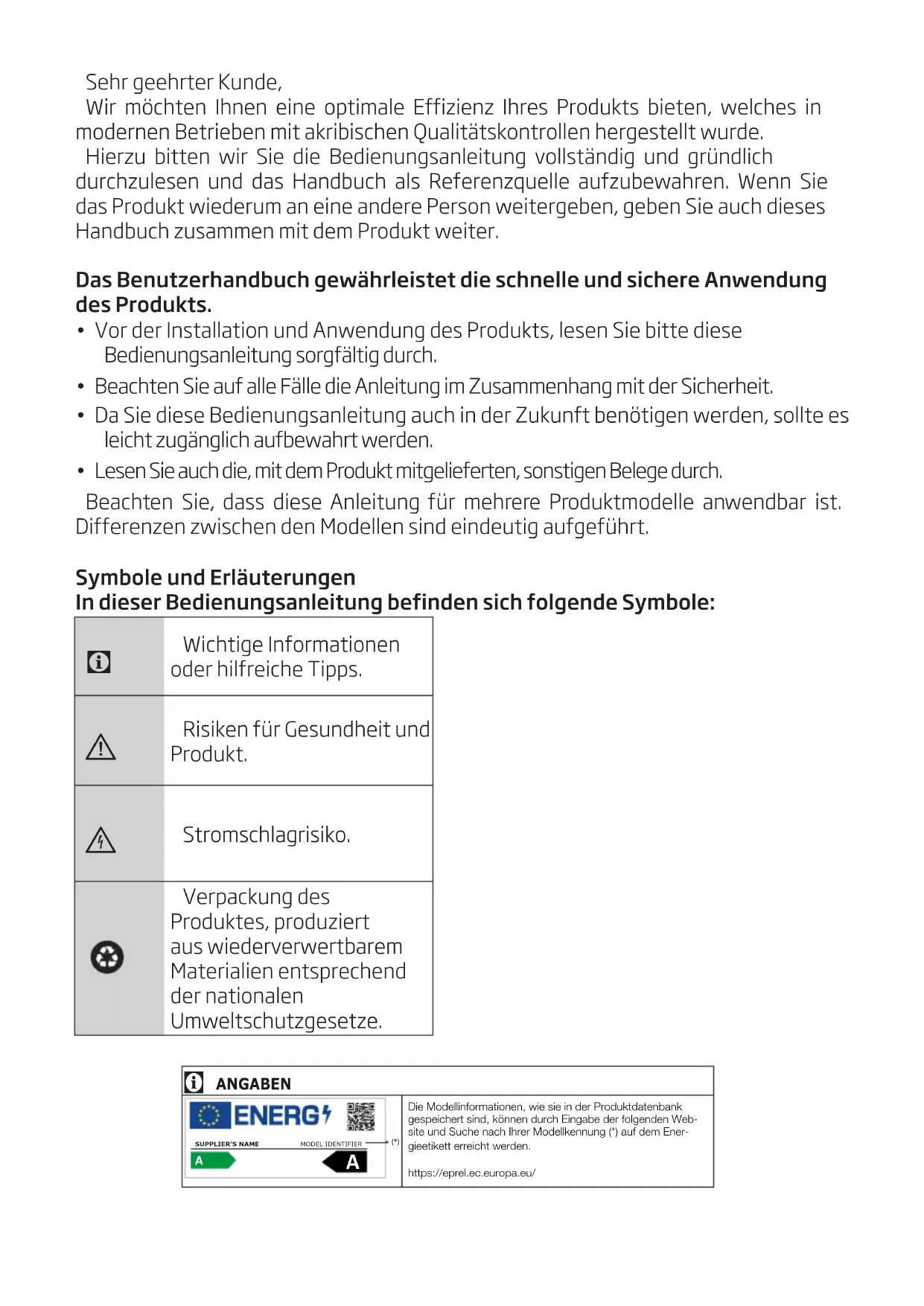 Die Modellinformationen, wie sie in der Produktdatenbank gespeichert sind, können durch Eingabe der folgenden Web-site und Suche nach Ihrer Modellkennung (*) auf dem Ener-gieetikett erreicht werden.https://eprel.ec.europa.eu/