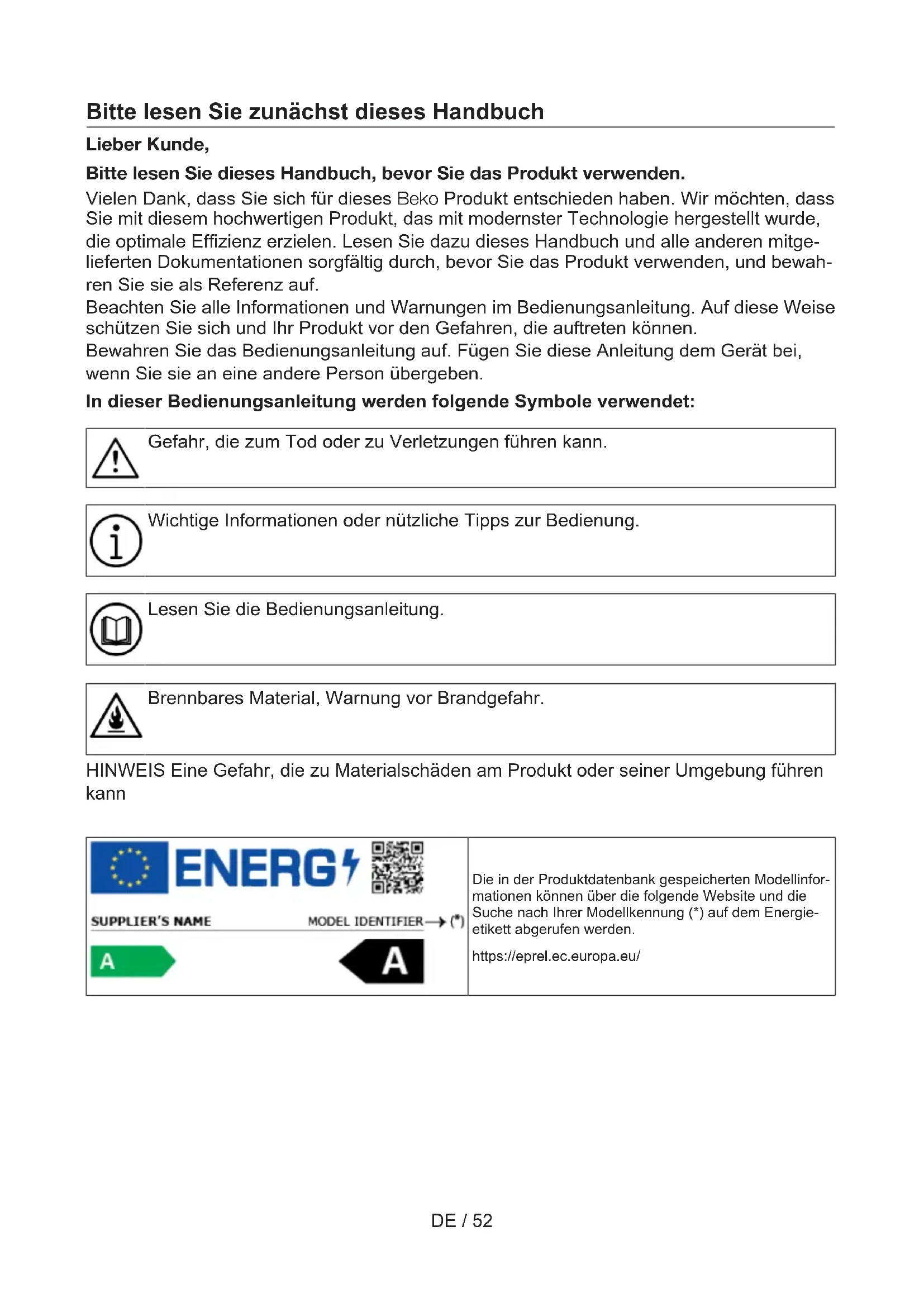 Bitte lesen Sie zunächst dieses Handbuch Lieber Kunde, Bitte lesen Sie dieses Handbuch, bevor Sie das Produkt verwenden. Vielen Dank, dass Sie sich für dieses Beko Produkt entschieden haben. Wir möchten, dass Sie mit diesem hochwertigen Produkt, das mit modernster Technologie hergestellt wurde, die optimale Effizienz erzielen. Lesen Sie dazu dieses Handbuch und alle anderen mitge- lieferten Dokumentationen sorgfältig durch, bevor Sie das Produkt verwenden, und bewah- ren Sie sie als Referenz auf. Beachten Sie alle Informationen und Warnungen im Bedienungsanleitung. Auf diese Weise schützen Sie sich und Ihr Produkt vor den Gefahren, die auftreten können. Bewahren Sie das Bedienungsanleitung auf. Fügen Sie diese Anleitung dem Gerät bei, wenn Sie sie an eine andere Person übergeben. In dieser Bedienungsanleitung werden folgende Symbole verwendet: Gefahr, die zum Tod oder zu Verletzungen führen kann. Wichtige Informationen oder nützliche Tipps zur Bedienung. Lesen Sie die Bedienungsanleitung. Brennbares Material, Warnung vor Brandgefahr. HINWEIS Eine Gefahr, die zu Materialschäden am Produkt oder seiner Umgebung führen kann Die in der Produktdatenbank gespeicherten Modellinfor- mationen können über die folgende Website und die Suche nach Ihrer Modellkennung (*) auf dem Energie- etikett abgerufen werden. https://eprel.ec.europa.eu/DE / 53 1 Sicherheitshinweise...................... 54
