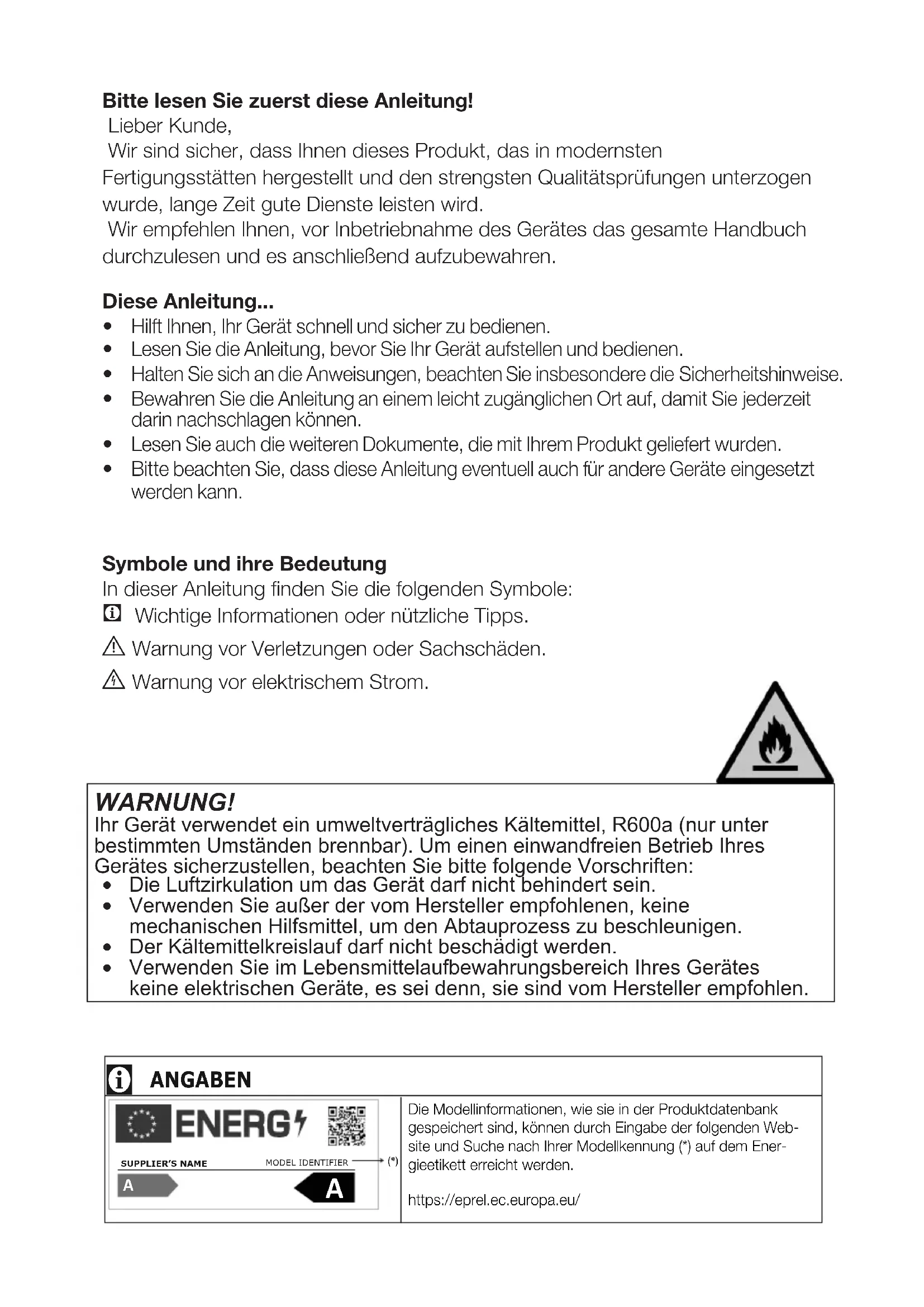 Bitte beachten Sie, dass diese Anleitung eventuell auch für andere Geräte eingesetzt werden kann. Symbole und ihre Bedeutung In dieser Anleitung finden Sie die folgenden Symbole: C Wichtige Informationen oder nützliche Tipps. A Warnung vor Verletzungen oder Sachschäden. B Warnung vor elektrischem Strom. WARNUNG! Ihr Gerät verwendet ein umweltverträgliches Kältemittel, R600a (nur unter bestimmten Umständen brennbar). Um einen einwandfreien Betrieb Ihres Gerätes sicherzustellen, beachten Sie bitte folgende Vorschriften: