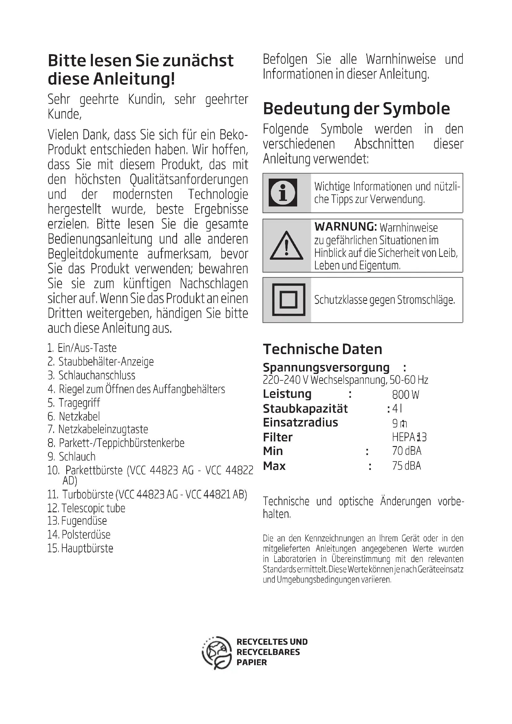 VCC 44822 AD - Staubsauger BEKO - Kostenlose Bedienungsanleitung