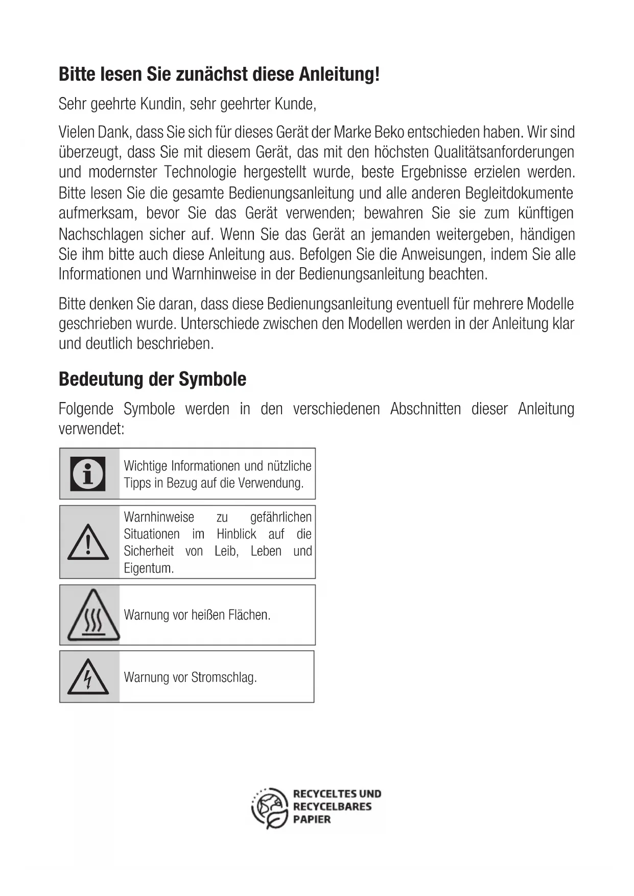 El garante e importador de su electrodoméstico es: BEKO SPAIN ELECTRONICS, S.L. Calle Provenza nº 388 3º Barcelona 08025, España. Conózcanos mejor en nuestra página: www.beko.com Conserve este documento, es importante para usted. (*) Se consideran electrodomésticos de gama blanca, los aparatos de gran tamaño de cocina, limpieza, refrigeración y ventilación y el pequeño aparato electrodoméstico (PAE) aquellos aparatos de higiene personal, mantenimiento del hogar y preparación de alimentos.Bitte lesen Sie zunächst diese Anleitung! Sehr geehrte Kundin, sehr geehrter Kunde, Vielen Dank, dass Sie sich für dieses Gerät der Marke Beko entschieden haben. Wir sind überzeugt, dass Sie mit diesem Gerät, das mit den höchsten Qualitätsanforderungen und modernster Technologie hergestellt wurde, beste Ergebnisse erzielen werden. Bitte lesen Sie die gesamte Bedienungsanleitung und alle anderen Begleitdokumente aufmerksam, bevor Sie das Gerät verwenden; bewahren Sie sie zum künftigen Nachschlagen sicher auf. Wenn Sie das Gerät an jemanden weitergeben, händigen Sie ihm bitte auch diese Anleitung aus. Befolgen Sie die Anweisungen, indem Sie alle Informationen und Warnhinweise in der Bedienungsanleitung beachten. Bitte denken Sie daran, dass diese Bedienungsanleitung eventuell für mehrere Modelle geschrieben wurde. Unterschiede zwischen den Modellen werden in der Anleitung klar und deutlich beschrieben. Bedeutung der Symbole Folgende Symbole werden in den verschiedenen Abschnitten dieser Anleitung verwendet: