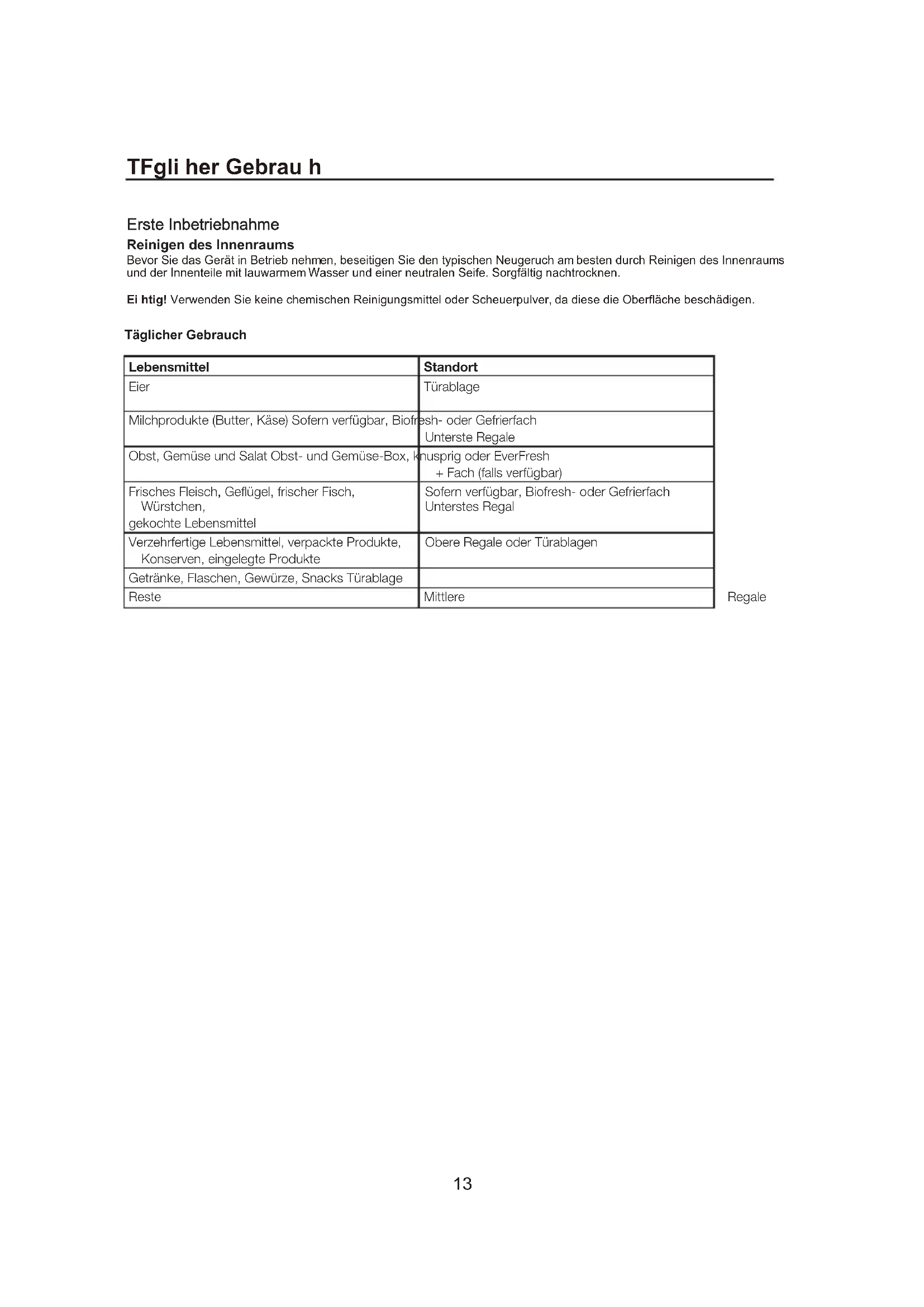 Lebensmittel Standort Eier Türablage Milchprodukte (Butter, Käse) Sofern verfügbar, Biofresh- oder Gefrierfach Unterste Regale Obst, Gemüse und Salat Obst- und Gemüse-Box, knusprig oder EverFresh + Fach (falls verfügbar) Frisches Fleisch, Geflügel, frischer Fisch, Würstchen, gekochte Lebensmittel Sofern verfügbar, Biofresh- oder Gefrierfach Unterstes Regal Verzehrfertige Lebensmittel, verpackte Produkte, Konserven, eingelegte Produkte Obere Regale oder Türablagen Getränke, Flaschen, Gewürze, Snacks Türablage Reste Mittlere Regale (UVWH,QEHWULHEQDKPH