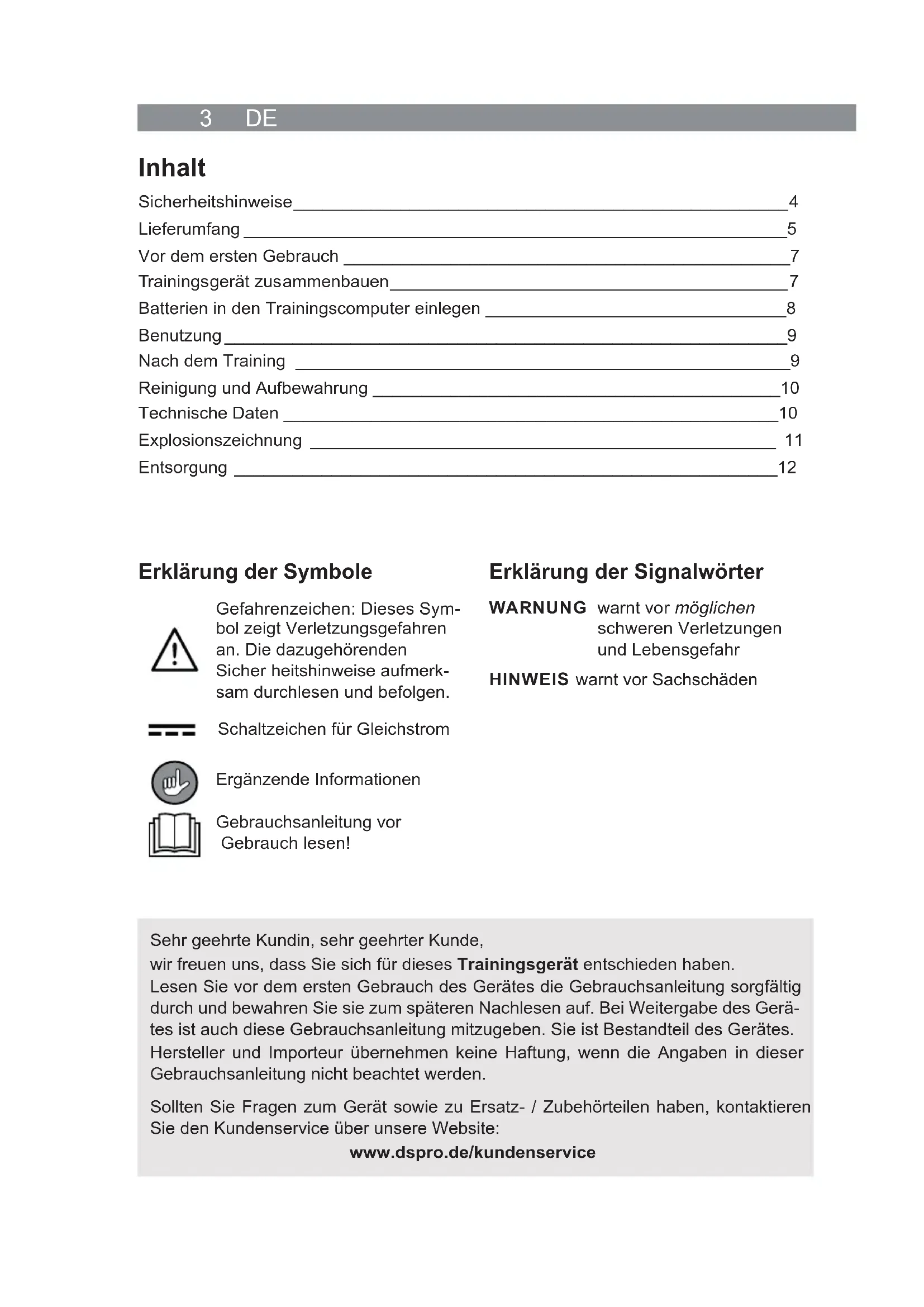 Handleiding vanaf pagina 343 DE Inhalt Sicherheitshinweise ___________________________________________________ 4 Lieferumfang ________________________________________________________5 Vor dem ersten Gebrauch ______________________________________________7 Trainingsgerät zus ammenbauen _________________________________________7 Batterien in den Trainingscomputer einlegen _______________________________8 Benutzung __________________________________________________________9 Nach dem Training ___________________________________________________9 Reinigung und Aufbewahrung __________________________________________10 Technische Daten ___________________________________________________10 Explosionszeichnung ________________________________________________ 11 Entsorgung ________________________________________________________12 Sehr geehrte Kundin, sehr geehrter Kunde, wir freuen uns, dass Sie sich für dieses Trainingsgerät entschieden haben. Lesen Sie vor dem ersten Gebrauch des Gerätes die Gebrauchsanleitung sorgfältig durch und bewahren Sie sie zum späteren Nachlesen auf. Bei Weitergabe des Gerä- tes ist auch diese Gebrauchsanleitung mitzugeben. Sie ist Bestandteil des Gerätes. Hersteller und Importeur übernehmen keine Haftung, wenn die Angaben in dieser Gebrauchsanleitung nicht beachtet werden. Sollten Sie Fragen zum Gerät sowie zu Ersatz- / Zubehörteilen haben, kontaktieren Sie den Kundenservice über unsere Website: www.dspro.de/kundenservice Erklärung der Symbole Gefahrenzeichen: Dieses Sym- bol zeigt Verletzungsgefahren an. Die dazugehörenden Sicher heitshinweise aufmerk- sam durchlesen und befolgen. Schaltzeichen für Gleichstrom Ergänzende Informationen Gebrauchsanleitung vor Gebrauch lesen! Erklärung der Signalwörter WARNUNG warnt vor möglichen schweren Verletzungen und Lebensgefahr HINWEIS warnt vor SachschädenDE 4 Bestimmungsgemäßer Gebrauch